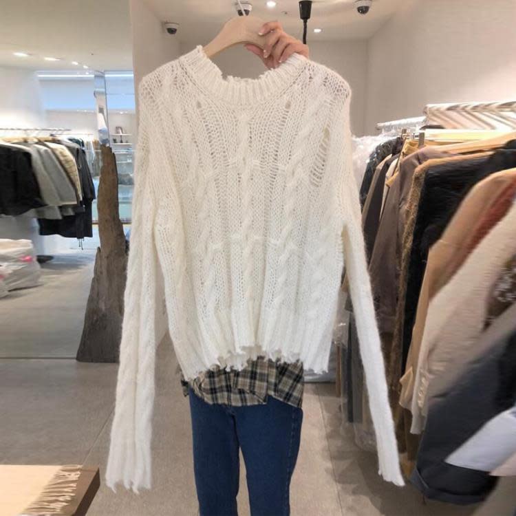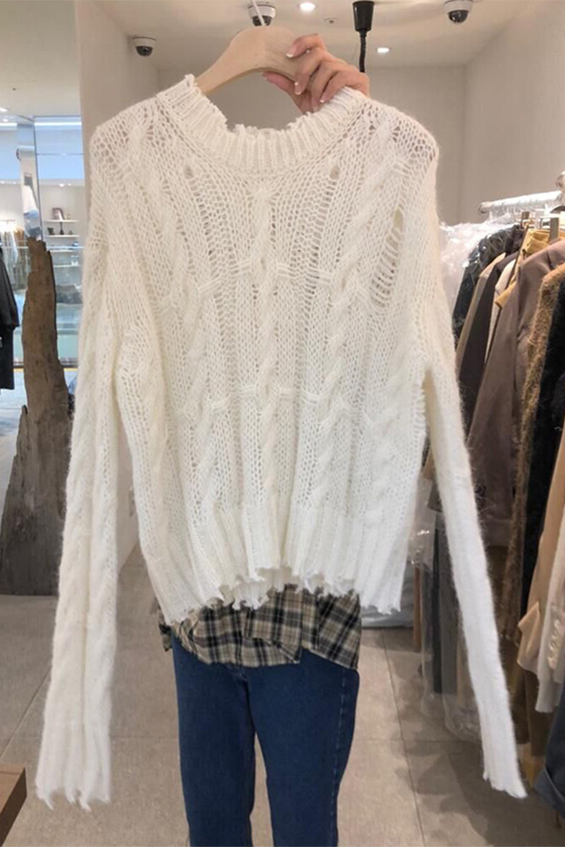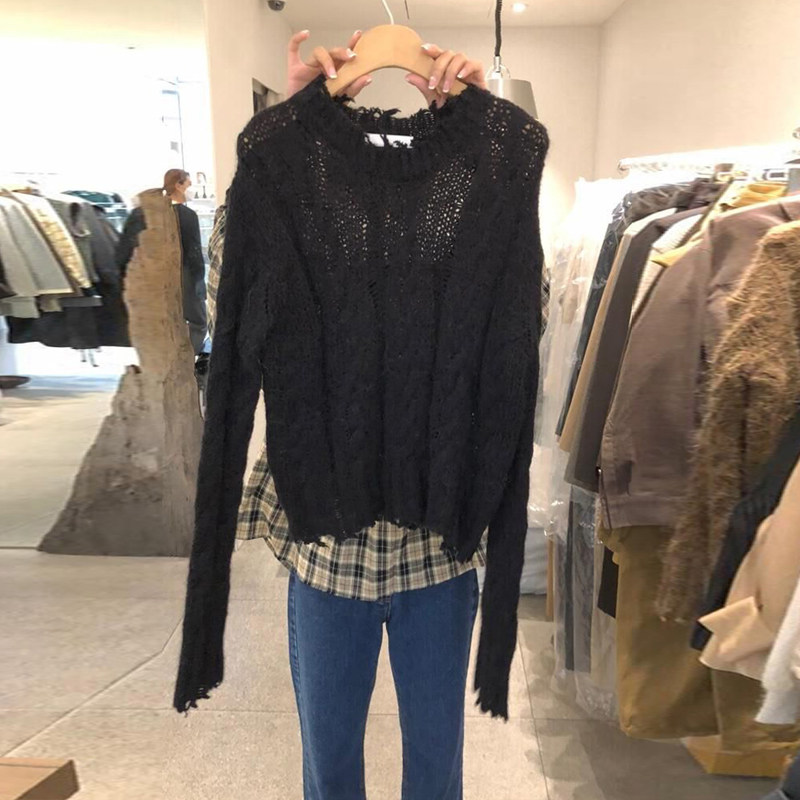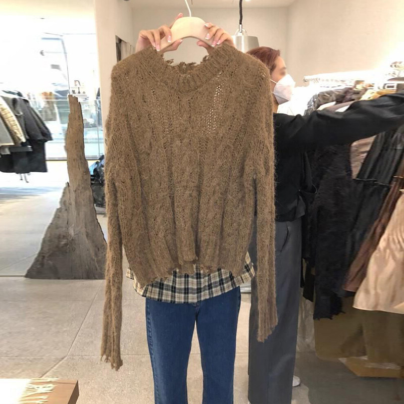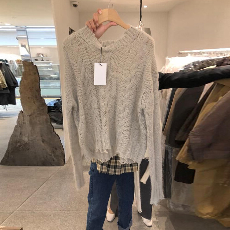DearGod正韓女裝麻花毛衣女薄款2022早秋新款設計感寬松破洞針織衫短款長袖上衣潮