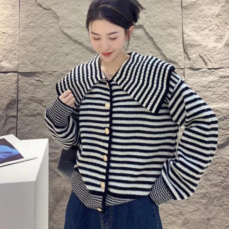 DearGod正韓女裝歐洲站2022秋季韓味大翻領金色排扣短款娃娃領條紋羊絨開衫毛衣女