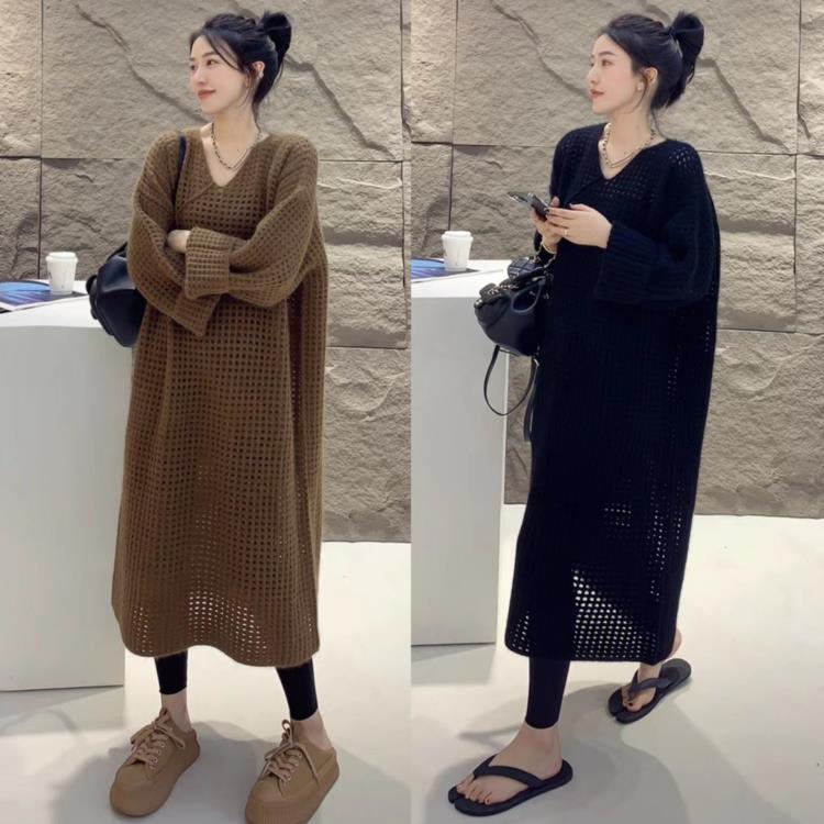DearGod正韓女裝歐洲站2022秋季歐美風圓領純色過膝中長款網格鏤空羊毛針織連身裙