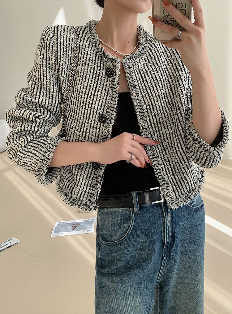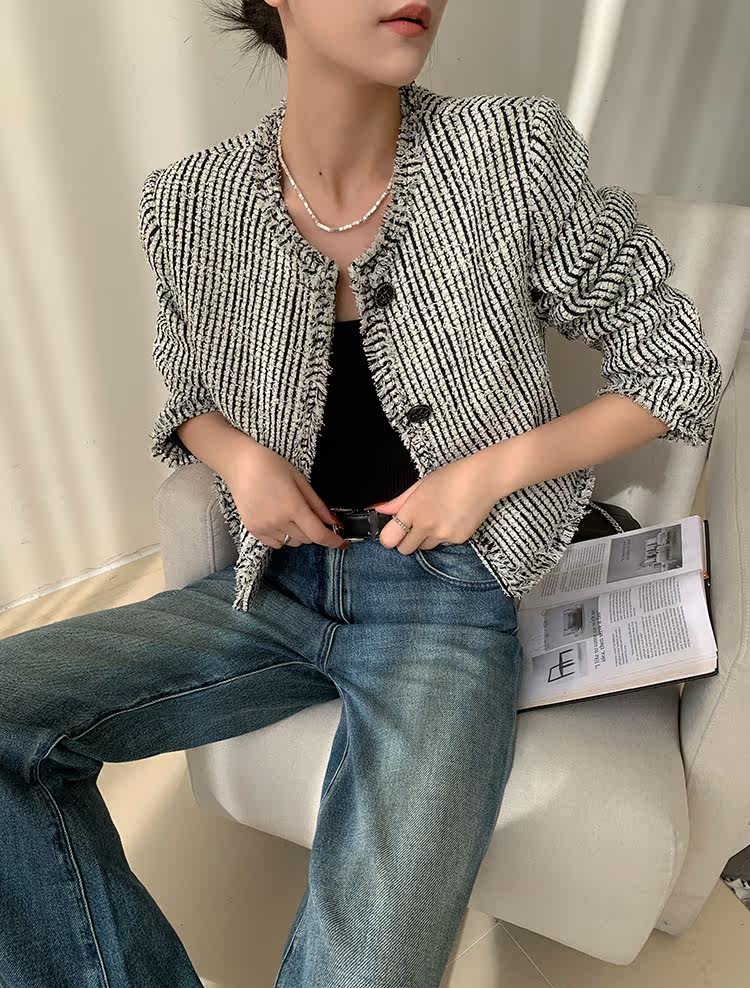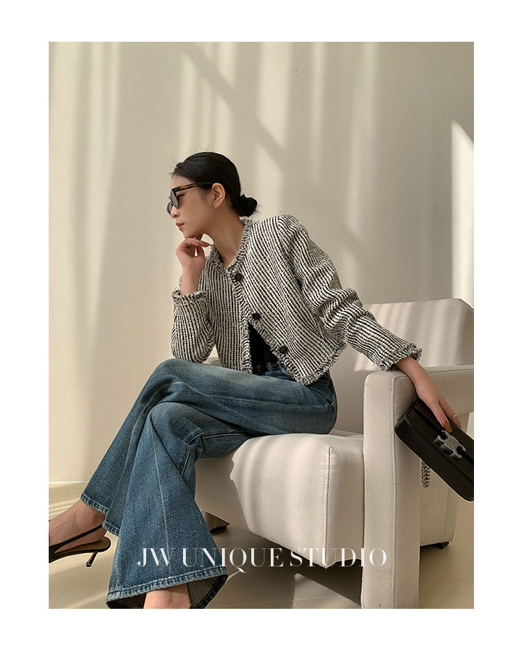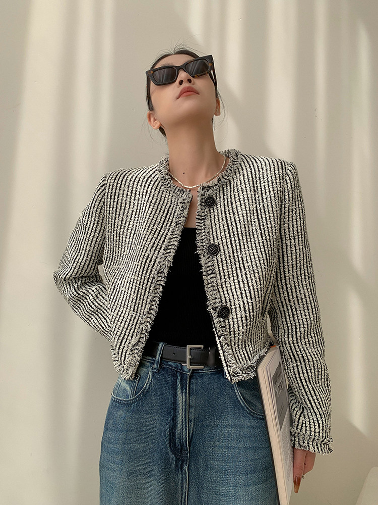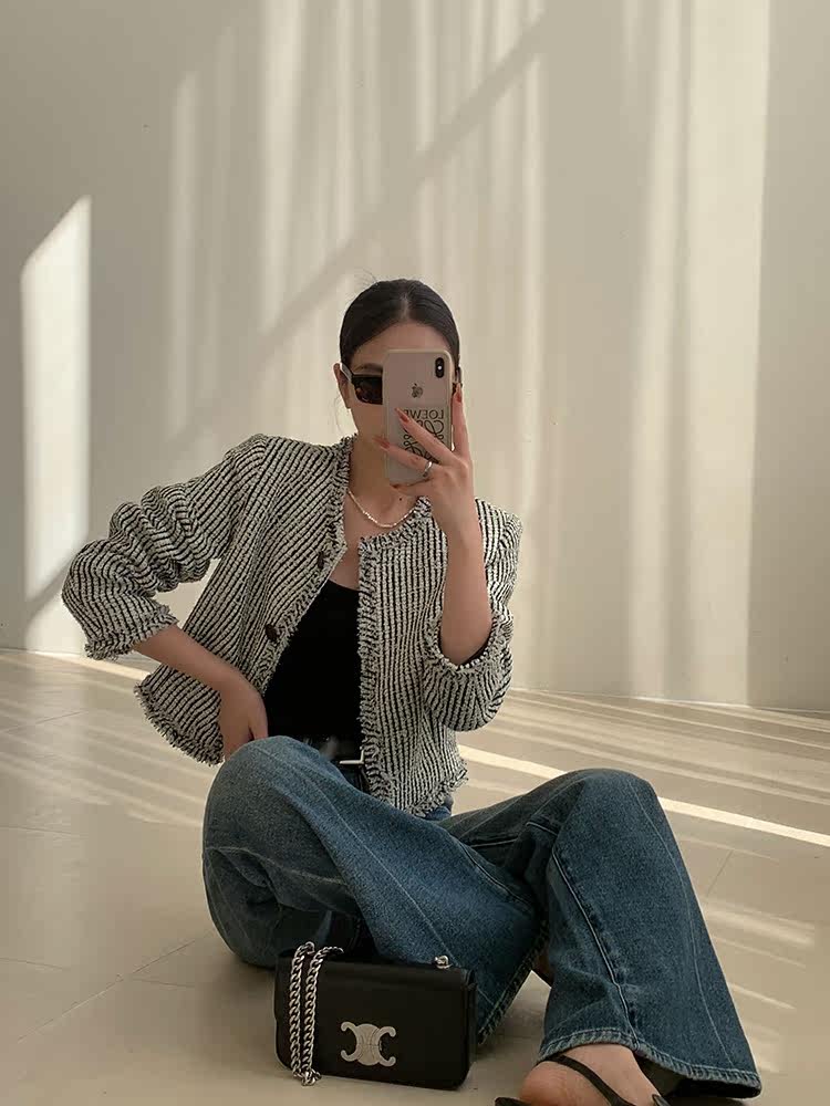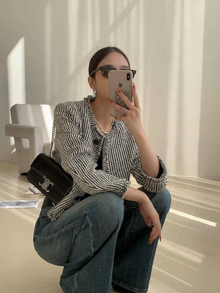 DearGod正韓女裝JWUNIQUE小香風短款外套女秋冬2022新款設計感通勤圓領格紋小上衣