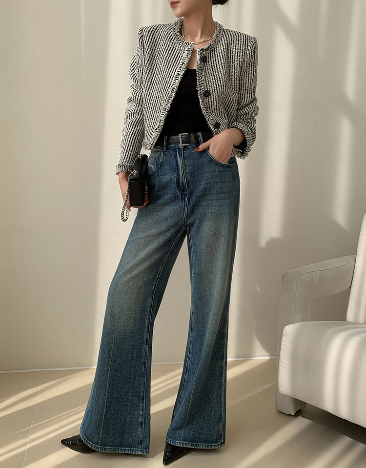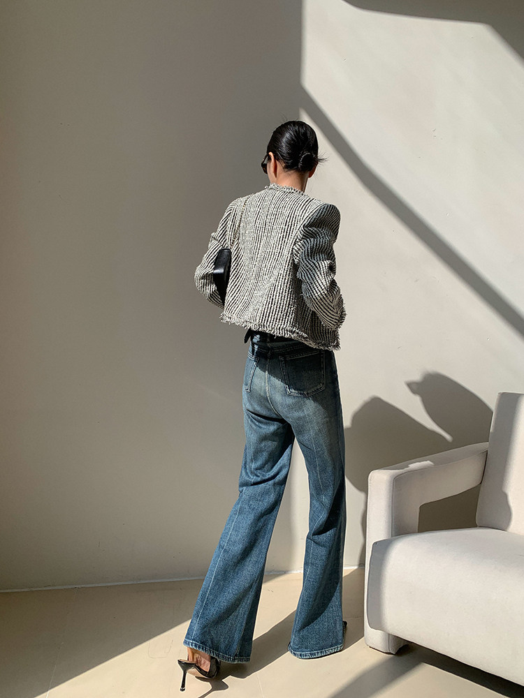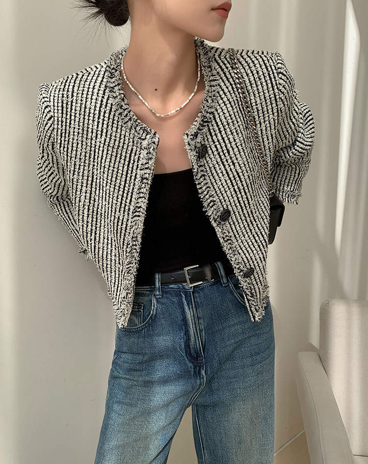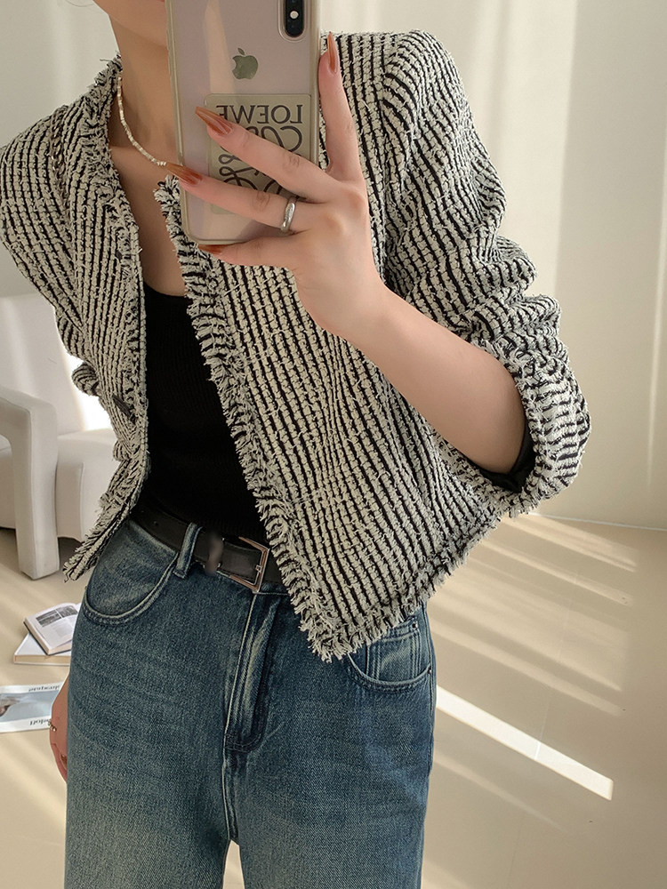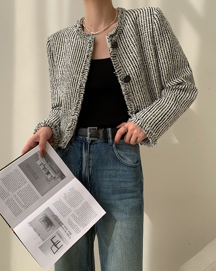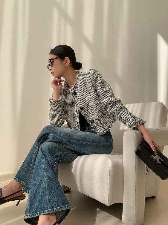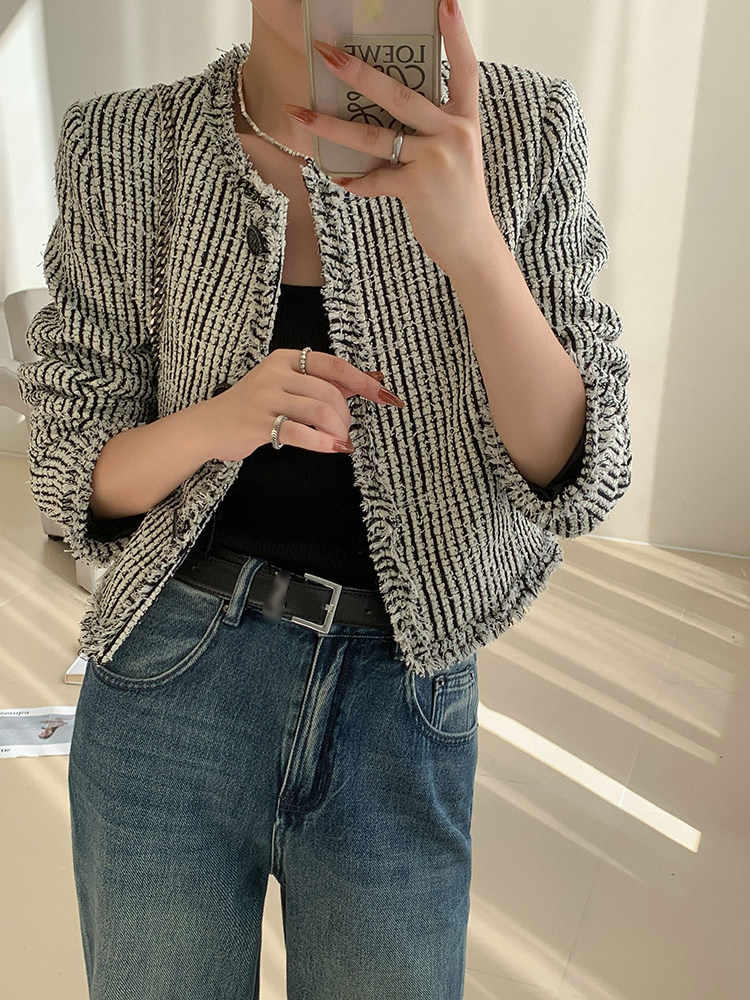 DearGod正韓女裝JWUNIQUE小香風短款外套女秋冬2022新款設計感通勤圓領格紋小上衣