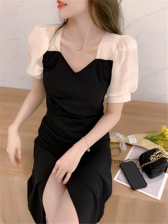 DearGod正韓女裝法式別致小眾收腰裙子洋裝質感高級感長裙設計感黑色V領連身裙女夏季