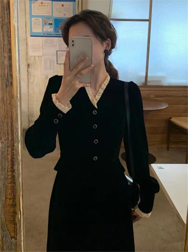 DearGod正韓女裝我的天啊!滿滿高級感設計~御姐長裙假兩件小香風黑色絲絨連身裙