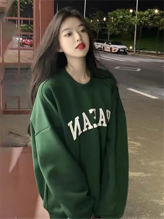 DearGod正韓女裝下衣失蹤~ 設計高級感慵懶風綠色百搭oversize衛衣加絨加厚女秋裝
