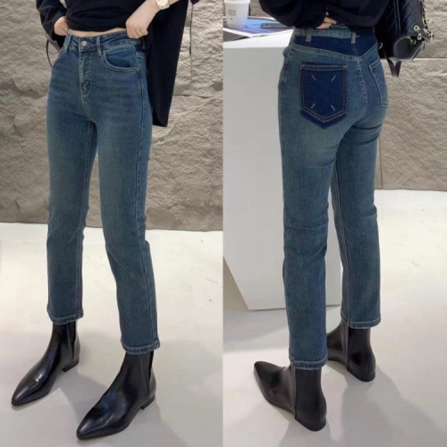 DearGod正韓女裝歐洲站2022秋季高腰口袋明線拼色彈力修身小直筒九分牛仔褲煙管褲