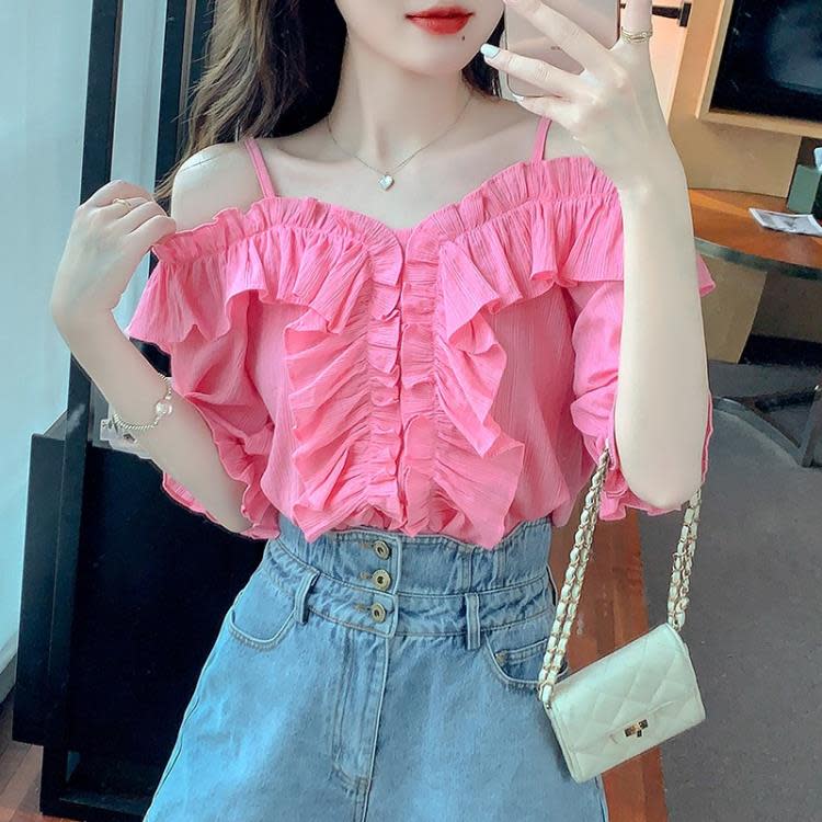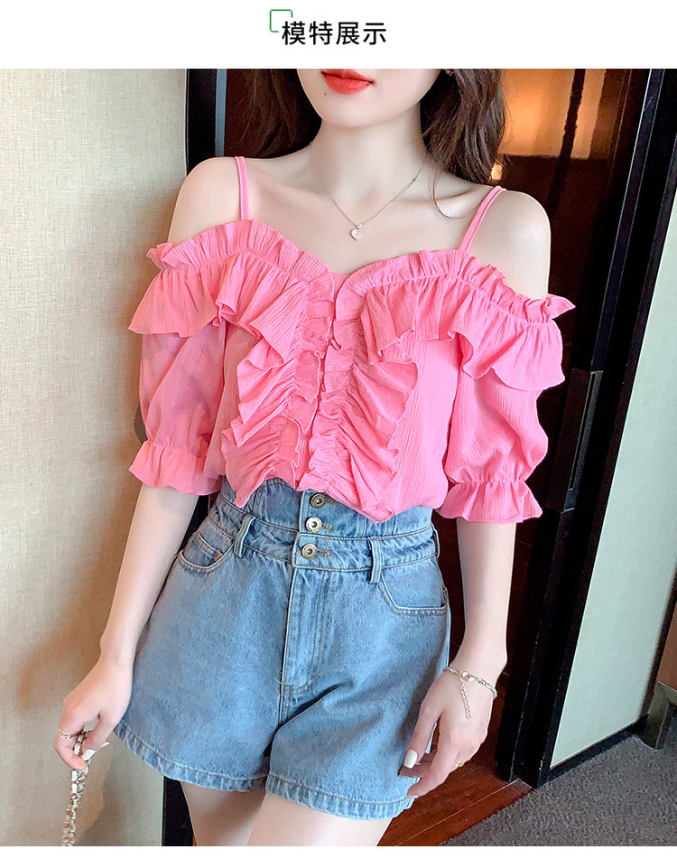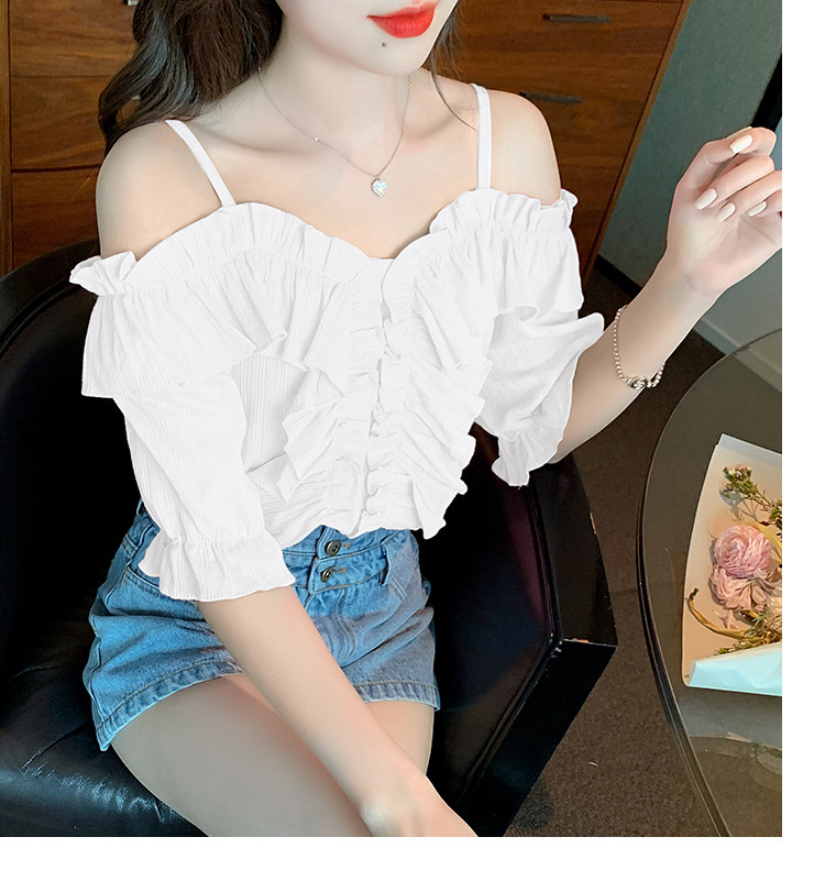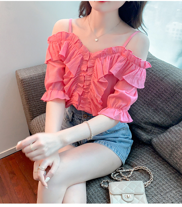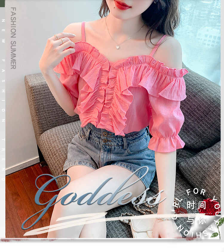 DearGod正韓女裝荷葉邊一字肩顯瘦吊帶短袖襯衫上衣夏季設計感小眾甜美別致襯衣女