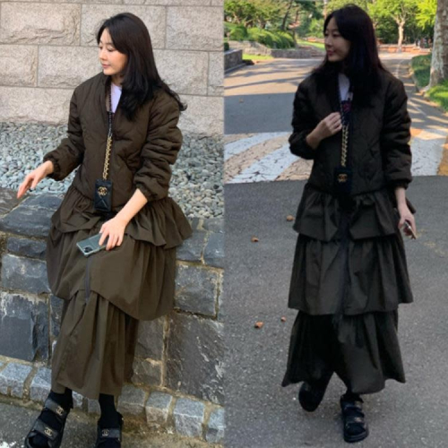 DearGod正韓女裝韓國ins冬季復古氣質圓領菱格顯瘦保暖棉服拼接疊層蛋糕連身裙女