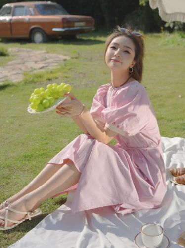 DearGod正韓女裝少女心粉色泡泡袖連身裙女2022夏季新款甜美減齡圓領溫柔風長裙子洋裝