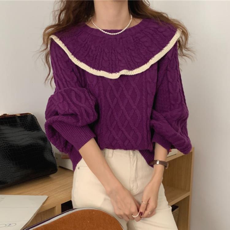 DearGod正韓女裝法式chic小眾撞色荷葉邊套頭毛衣女秋冬新款別致針織衫溫柔風上衣