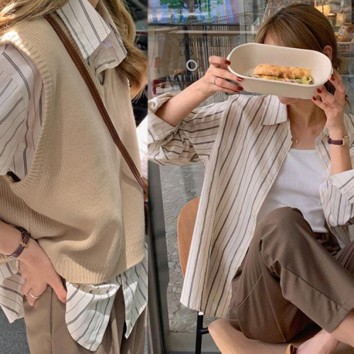 DearGod正韓女裝韓國chic秋冬洋氣減齡條紋襯衫 針織馬甲背心 闊腿褲網紅三件套女