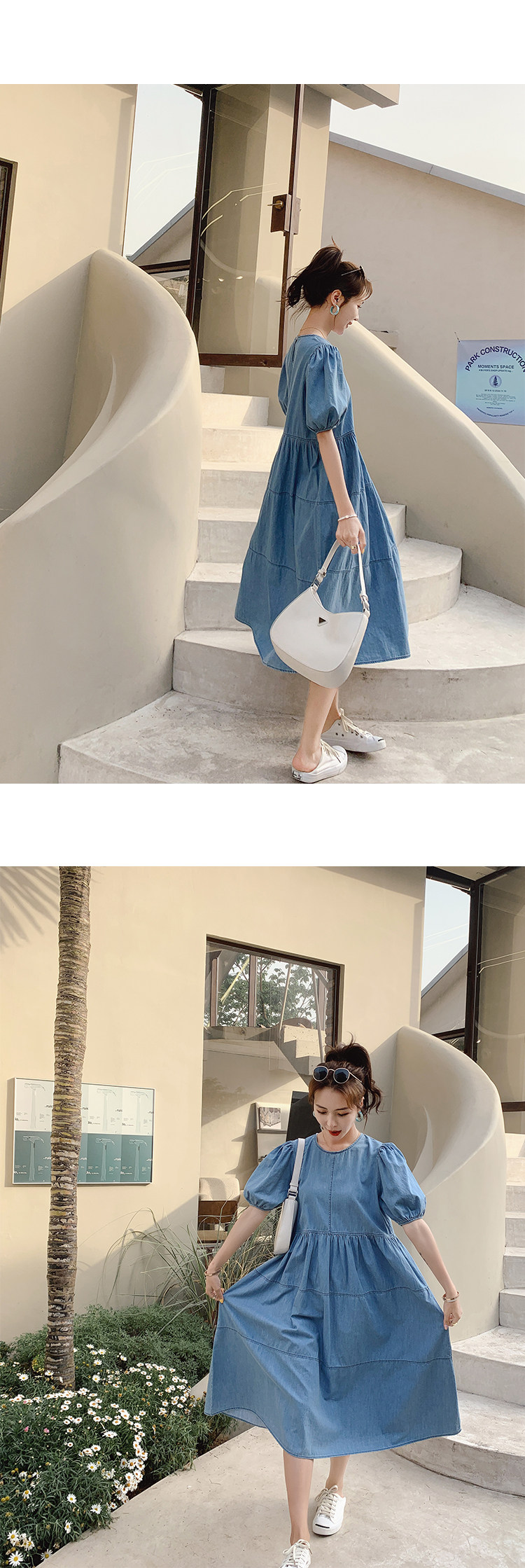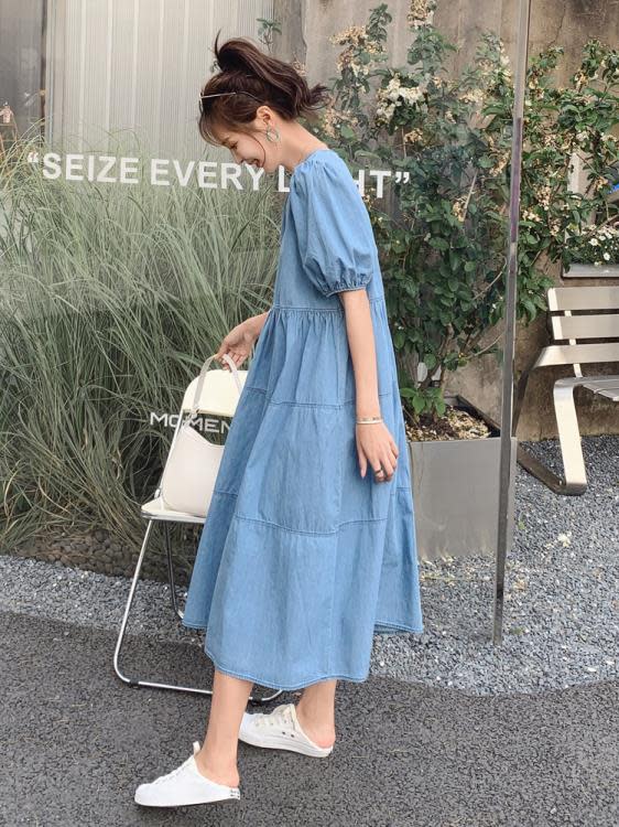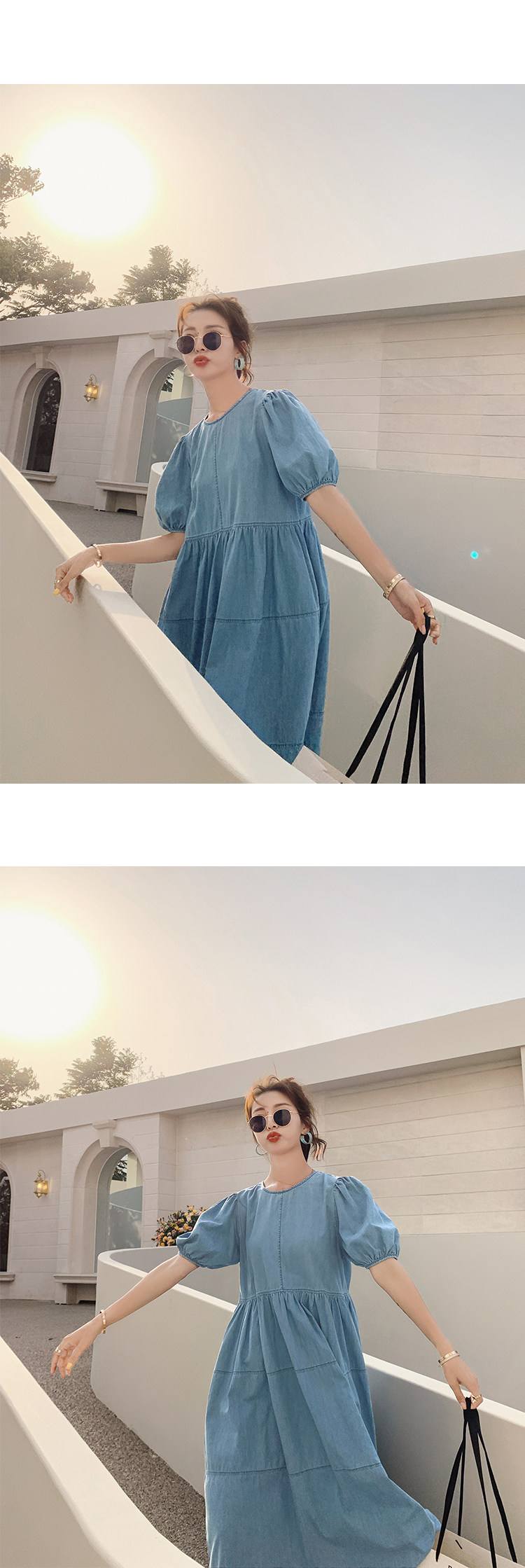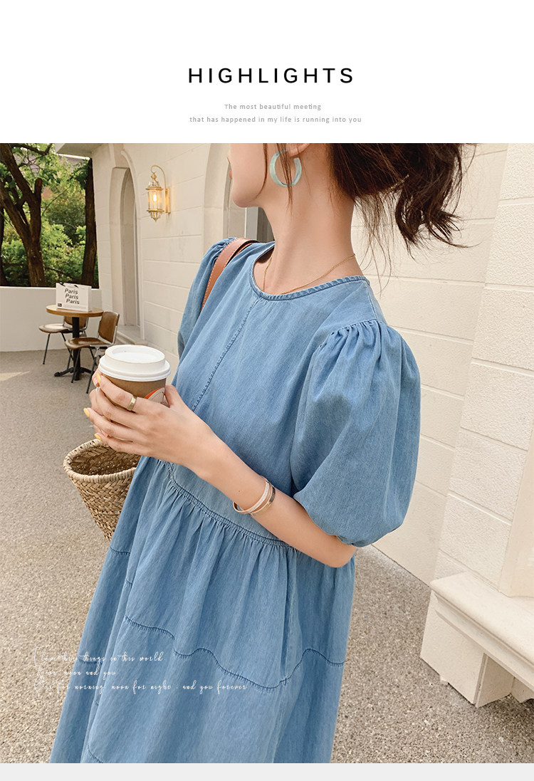 DearGod正韓女裝正韓寬松泡泡袖淺藍色牛仔連身裙女夏2022新款遮肚顯瘦法式長裙薄