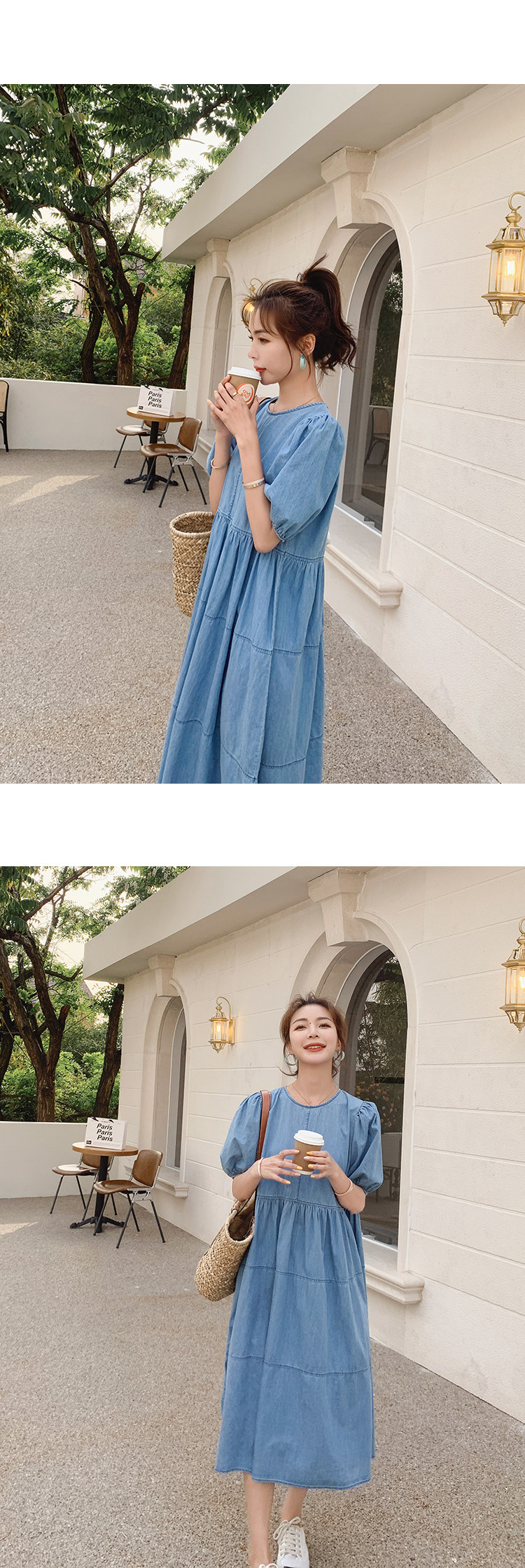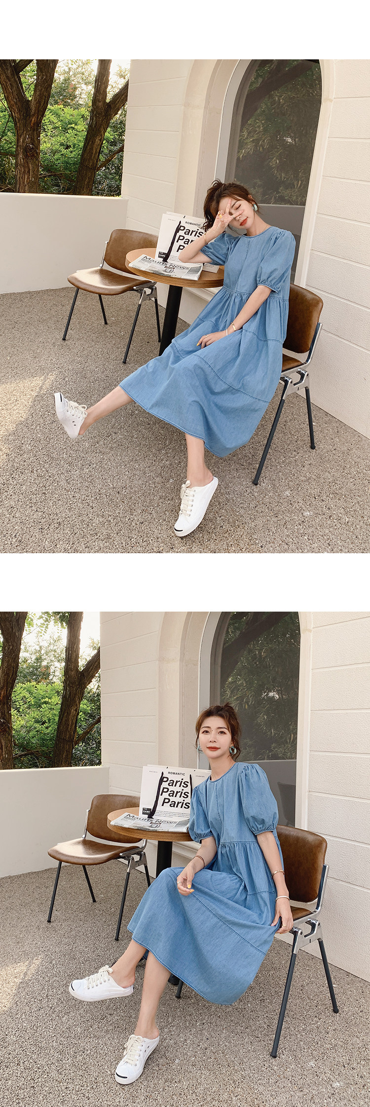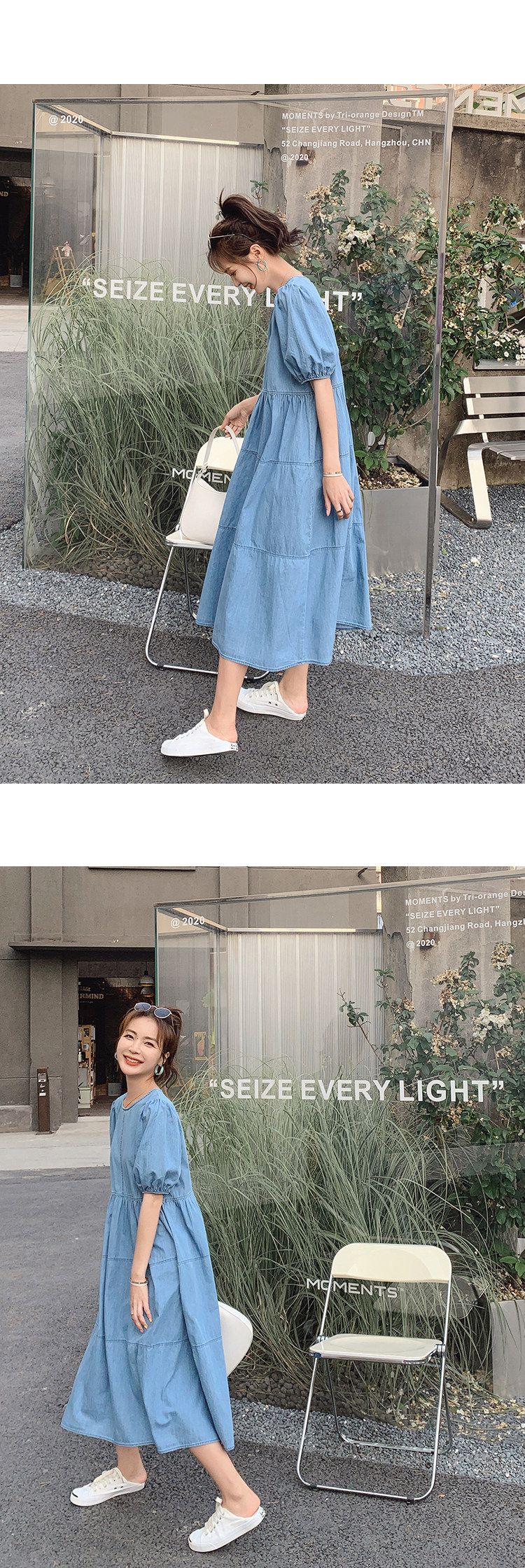 DearGod正韓女裝正韓寬松泡泡袖淺藍色牛仔連身裙女夏2022新款遮肚顯瘦法式長裙薄