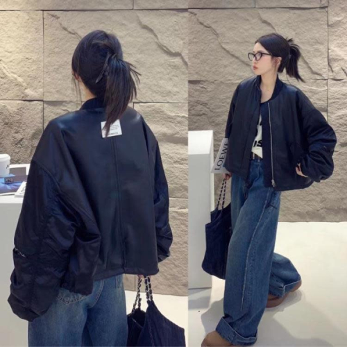 DearGod正韓女裝歐洲站202秋季立領后背貼標褶皺長袖拼接拉鍊A字版PU皮皮衣短外套