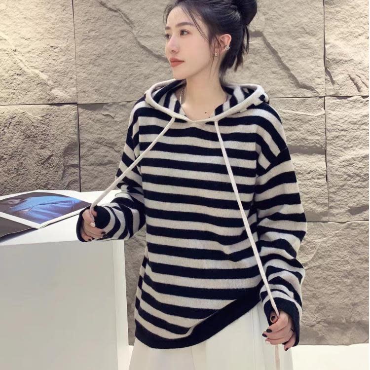DearGod正韓女裝歐洲站2022秋冬連帽經典條紋拼色慵懶長袖羊絨針織衫洋氣毛衣帽衫