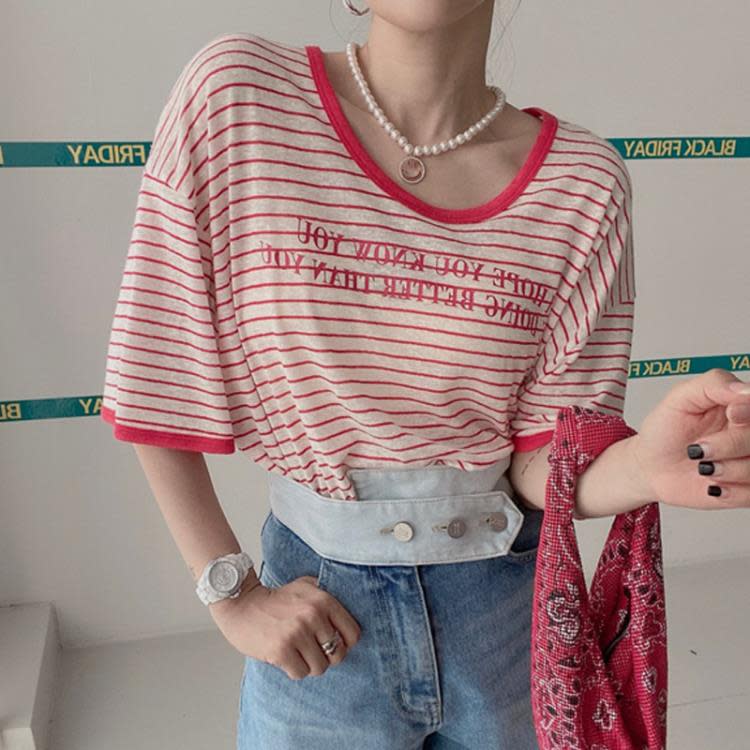 DearGod正韓女裝少量現貨 韓國東大門正品代新款 夏裝玫紅色橫條紋字母印花T恤衫