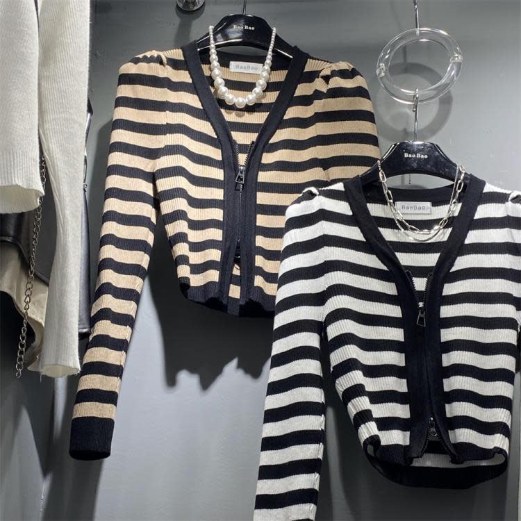 DearGod正韓女裝BaoBao秋冬季復古條紋拉鍊開衫毛衣外套女泡泡袖顯瘦針織長袖上衣
