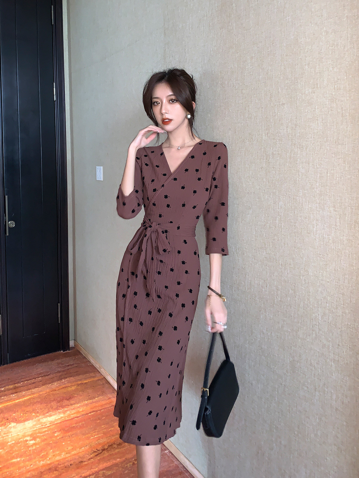 DearGod正韓女裝秋冬季新款2022法式復古收腰系帶波點開叉長裙氣質長袖連身裙女裝