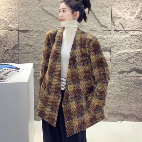 DearGod正韓女裝歐洲站2022秋冬歐貨V領墊肩長袖A字版復古香港咖格拼色西裝外套女