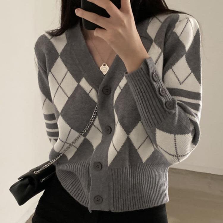 DearGod正韓女裝韓國chic秋季新款復古菱形撞色V領毛衣外套女氣質顯瘦針織開衫