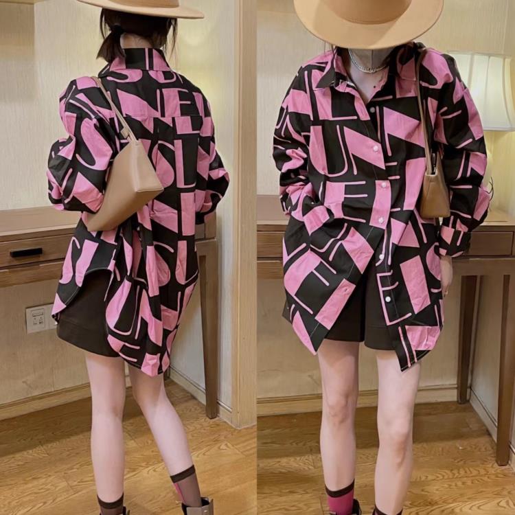 DearGod正韓女裝歐洲站2022秋季新款POLO領不規則圖形拼色排扣寬松時尚長袖襯衫女