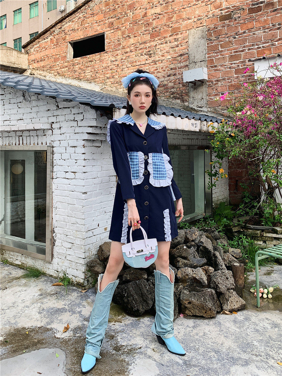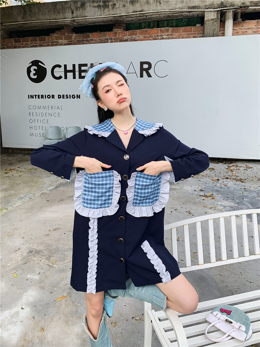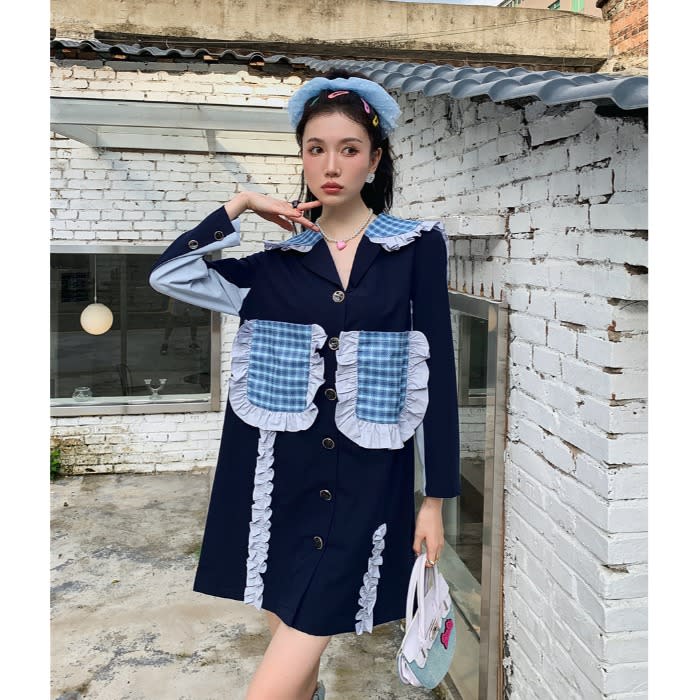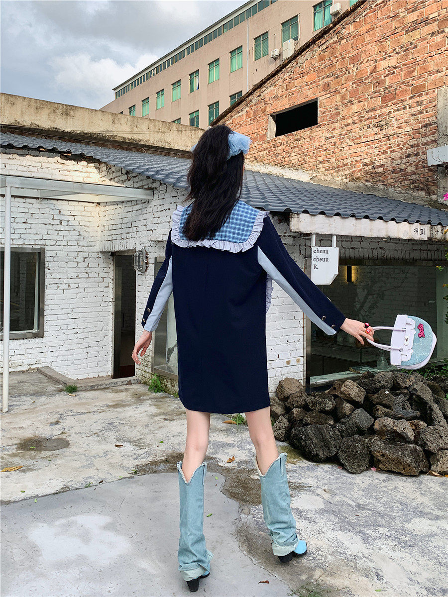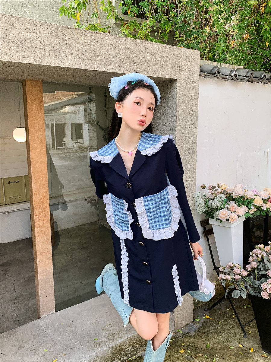 DearGod正韓女裝法式荷葉邊娃娃領格紋口袋西裝裙女秋季新款拼接木耳邊長袖連衣裙