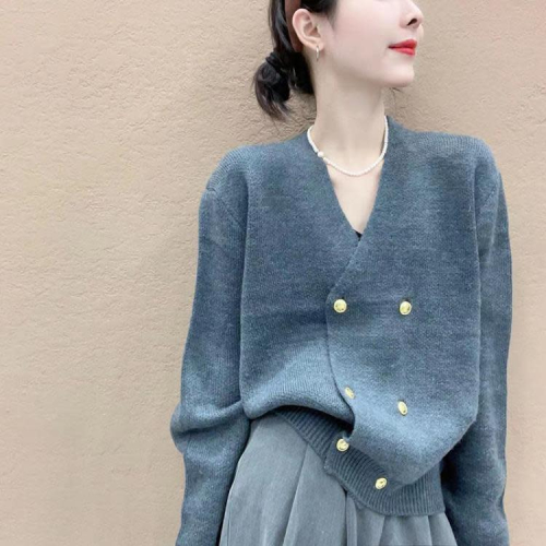DearGod正韓女裝歐貨2022年秋冬新款寬松顯瘦V領雙排扣長袖上衣細羊毛針織開衫女