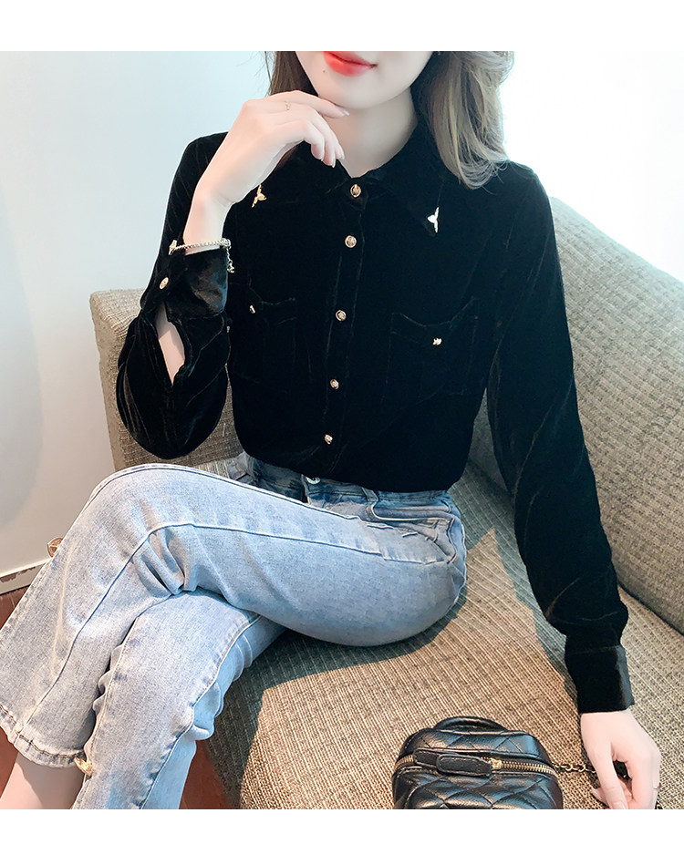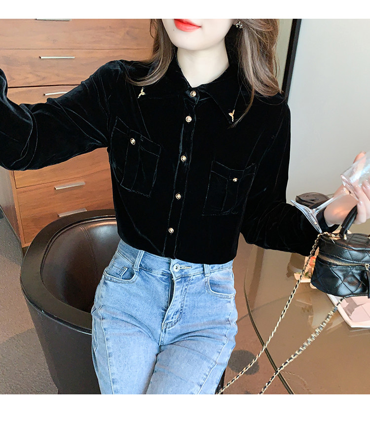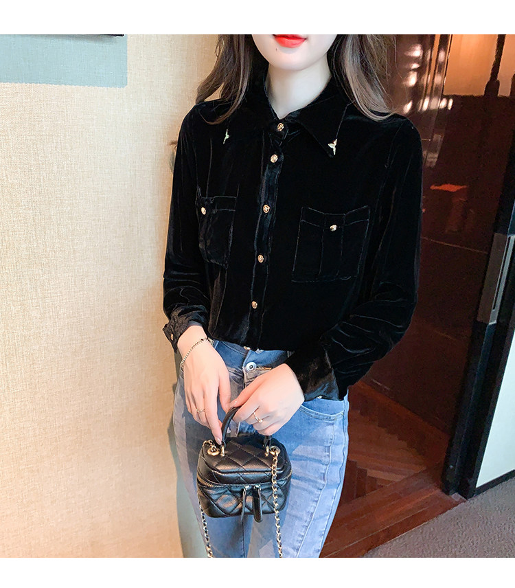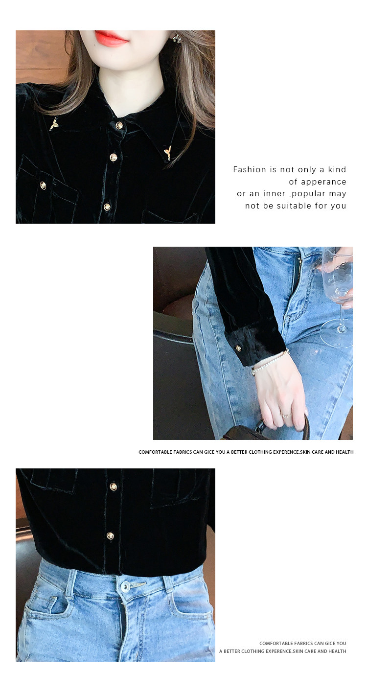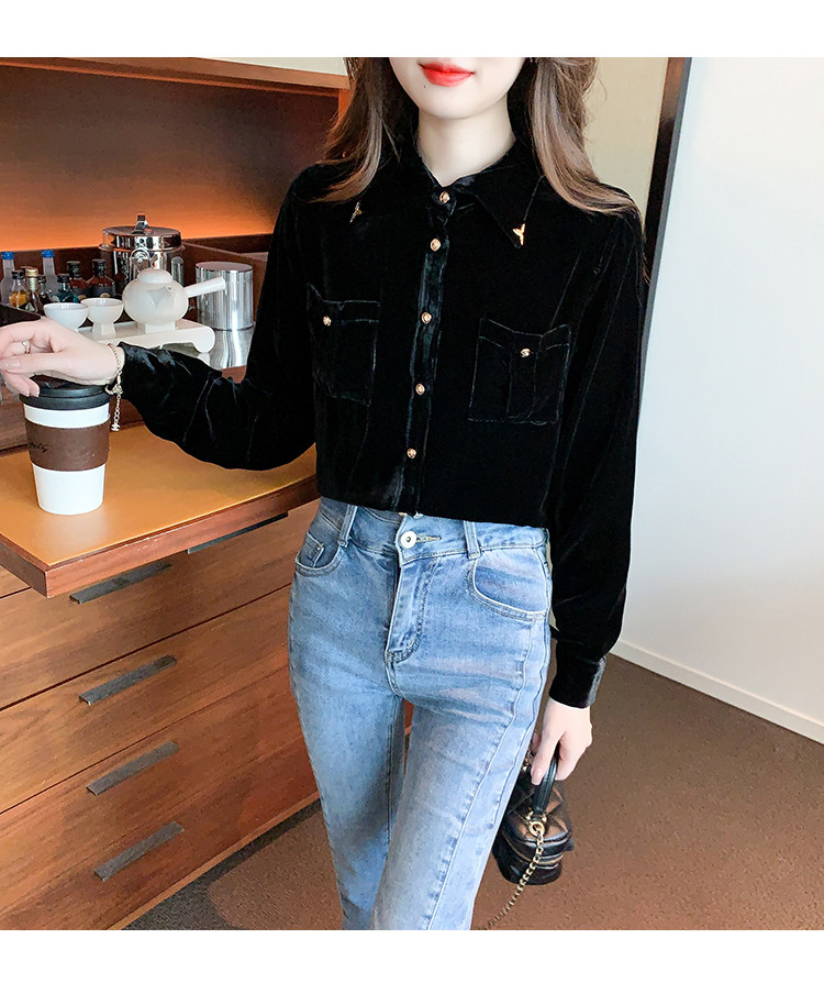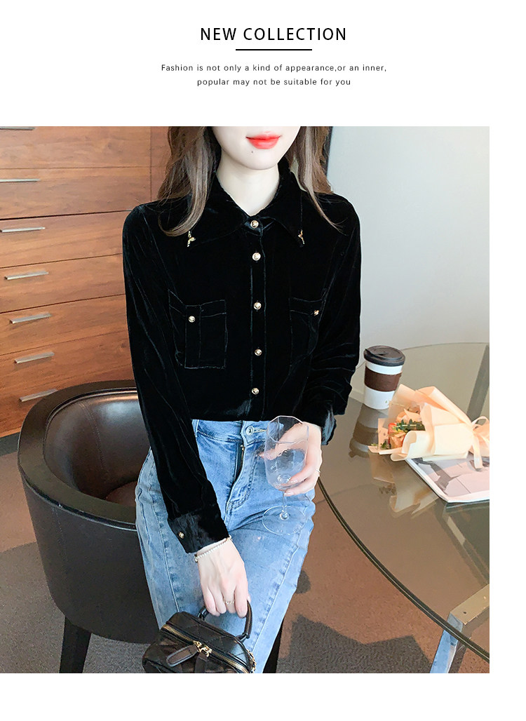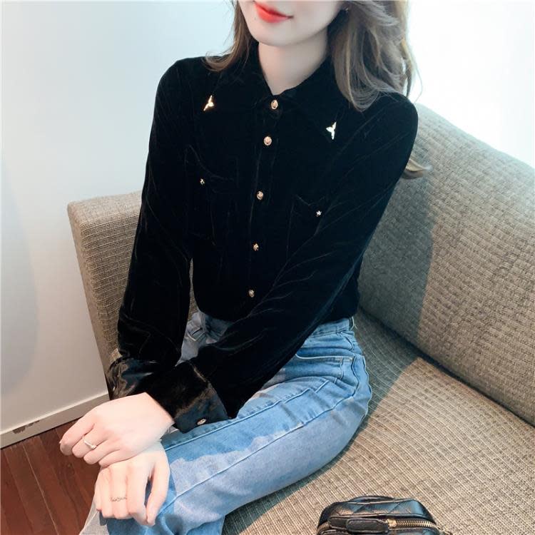 DearGod正韓女裝加絨黑色襯衣2022秋冬新款復古香港氣質長袖上衣洋氣金絲絨襯衫女