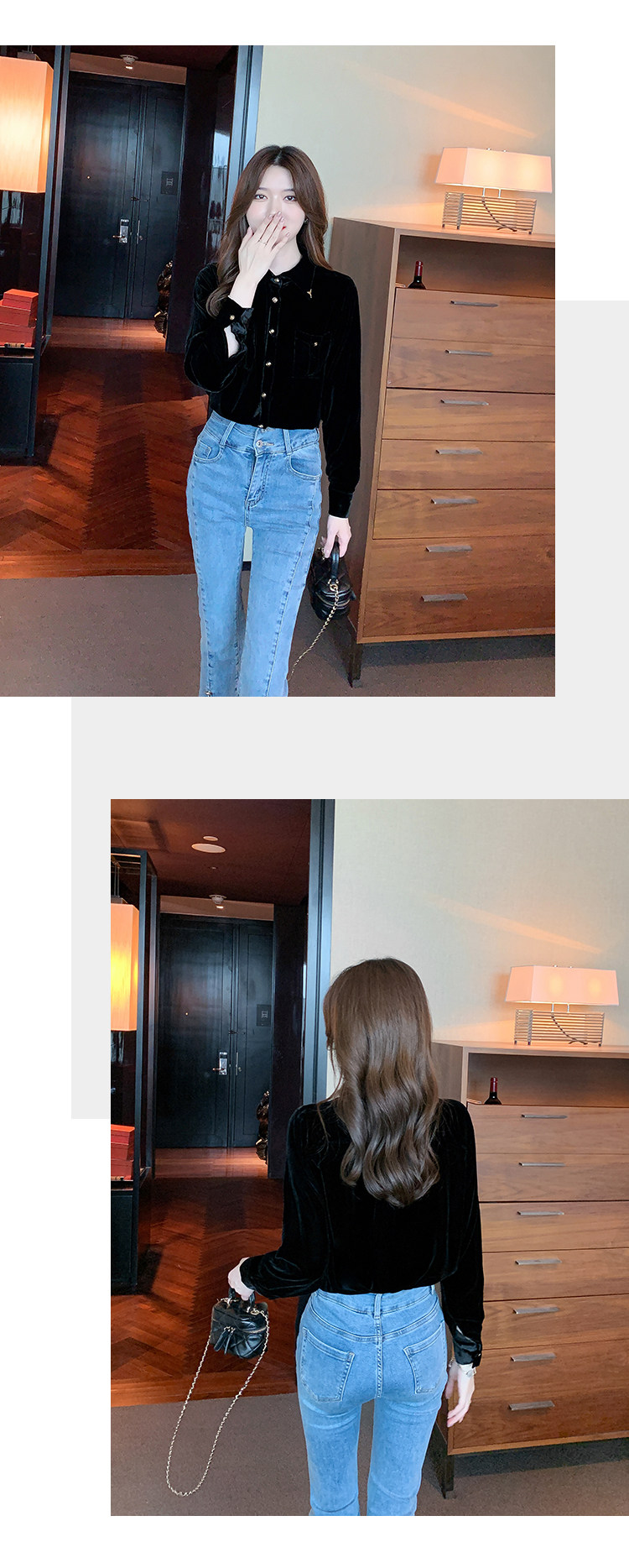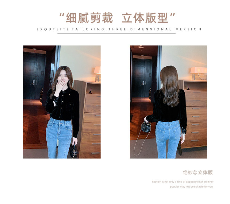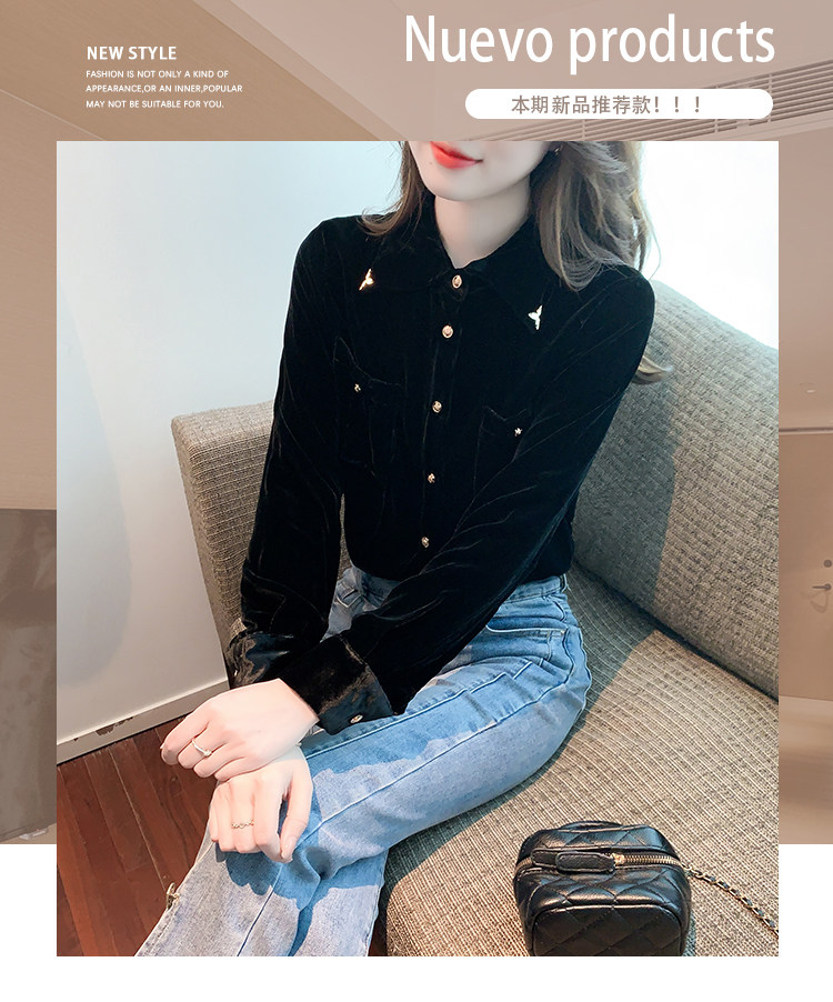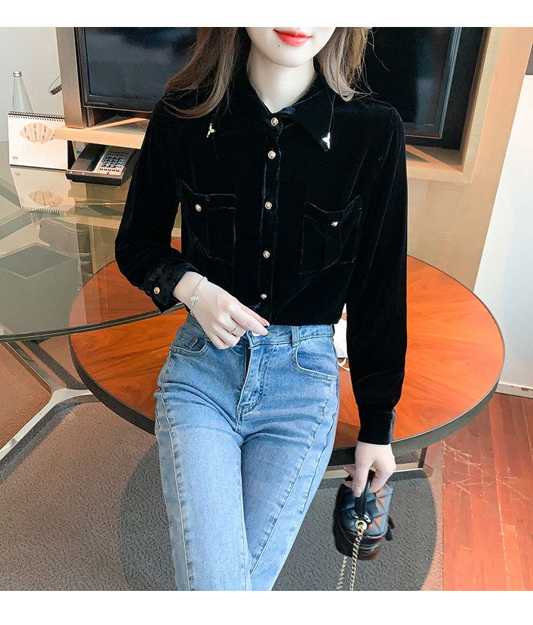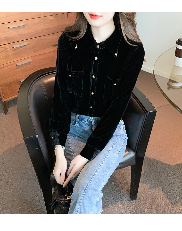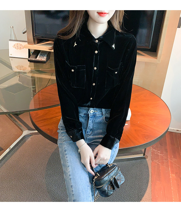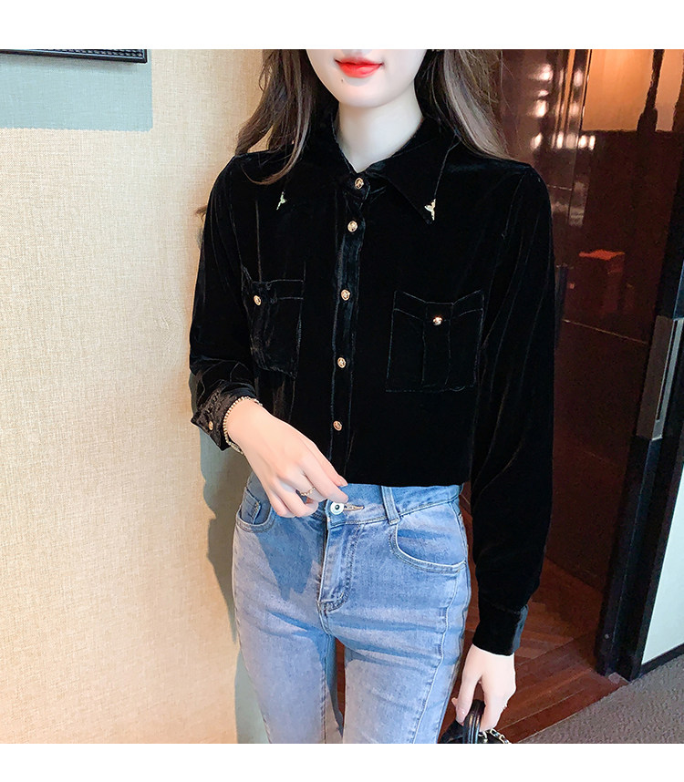 DearGod正韓女裝加絨黑色襯衣2022秋冬新款復古香港氣質長袖上衣洋氣金絲絨襯衫女