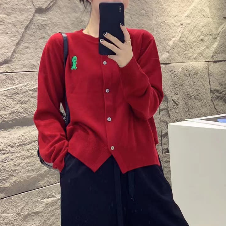 DearGod正韓女裝歐洲站2022秋季韓味圓領刺繡小恐龍羊毛針織開衫排扣毛衣薄外套女