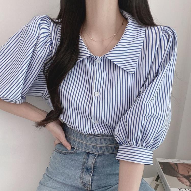 DearGod正韓女裝韓國chic夏季法式復古翻領單排扣休閒百搭泡泡袖條紋襯衫上衣女