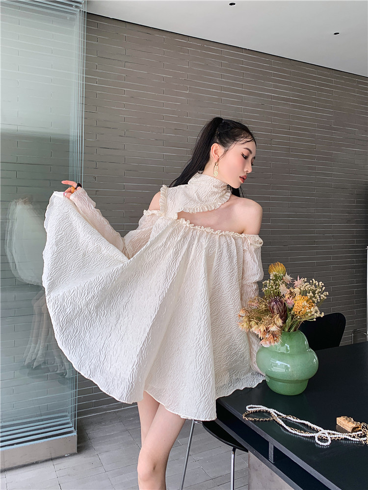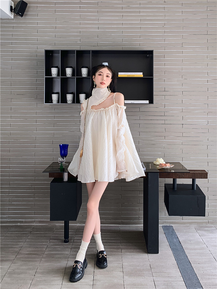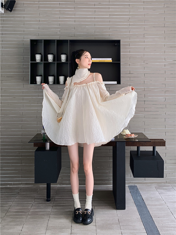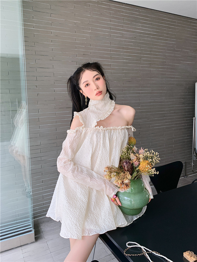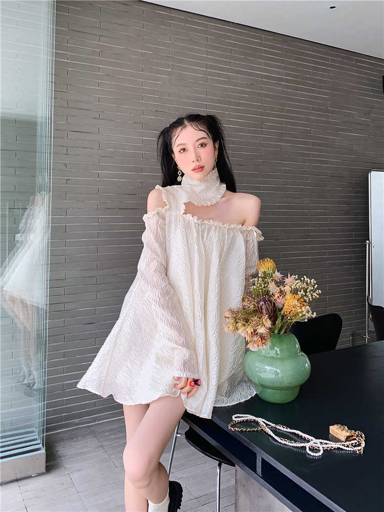 DearGod正韓女裝辣妹風長袖肌理感大擺連衣裙女秋高領鏤空不對稱露肩連衣裙蓬蓬裙