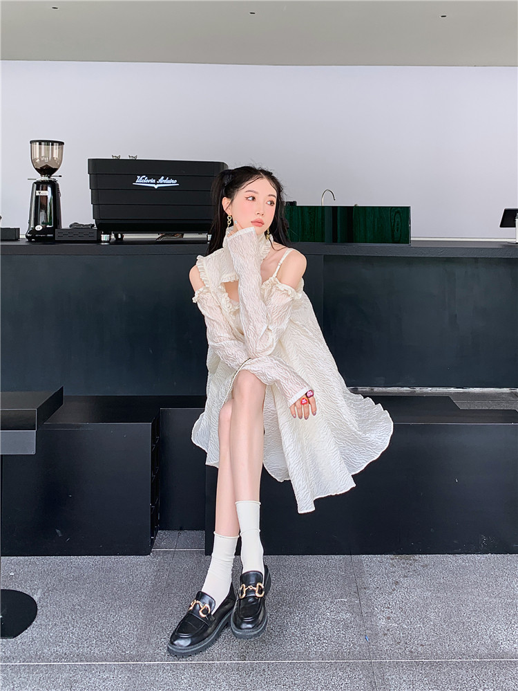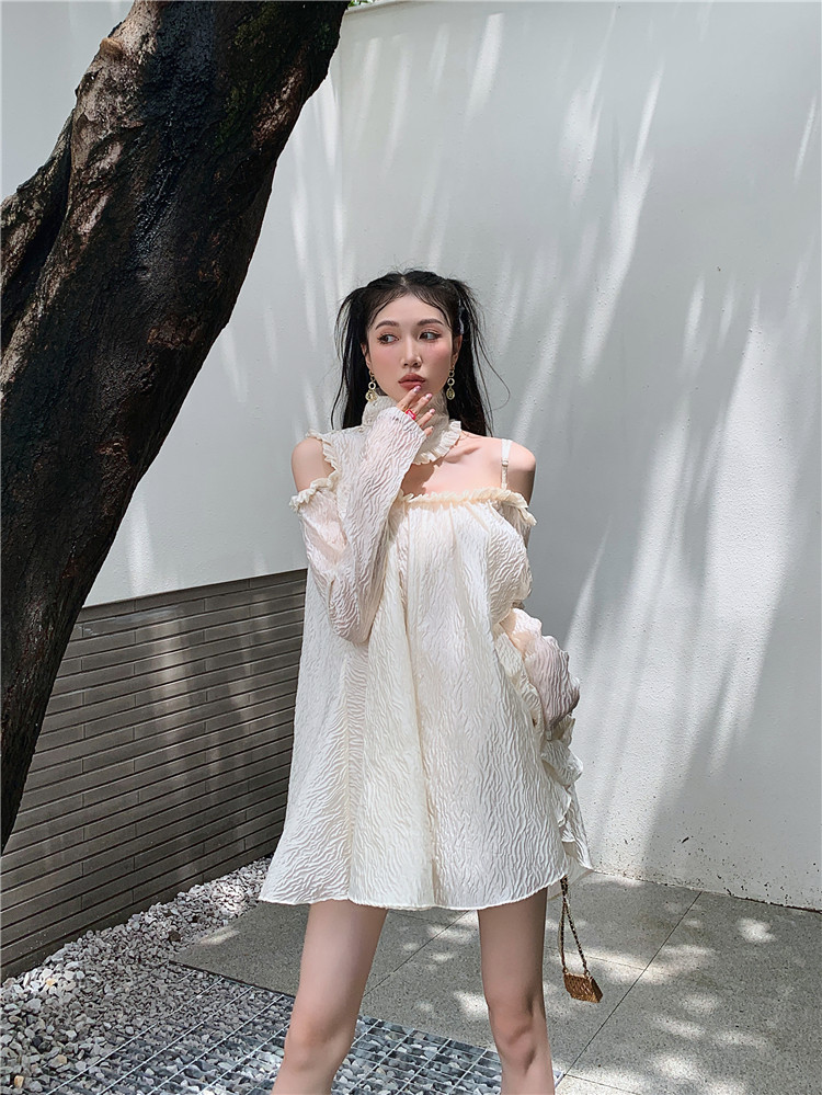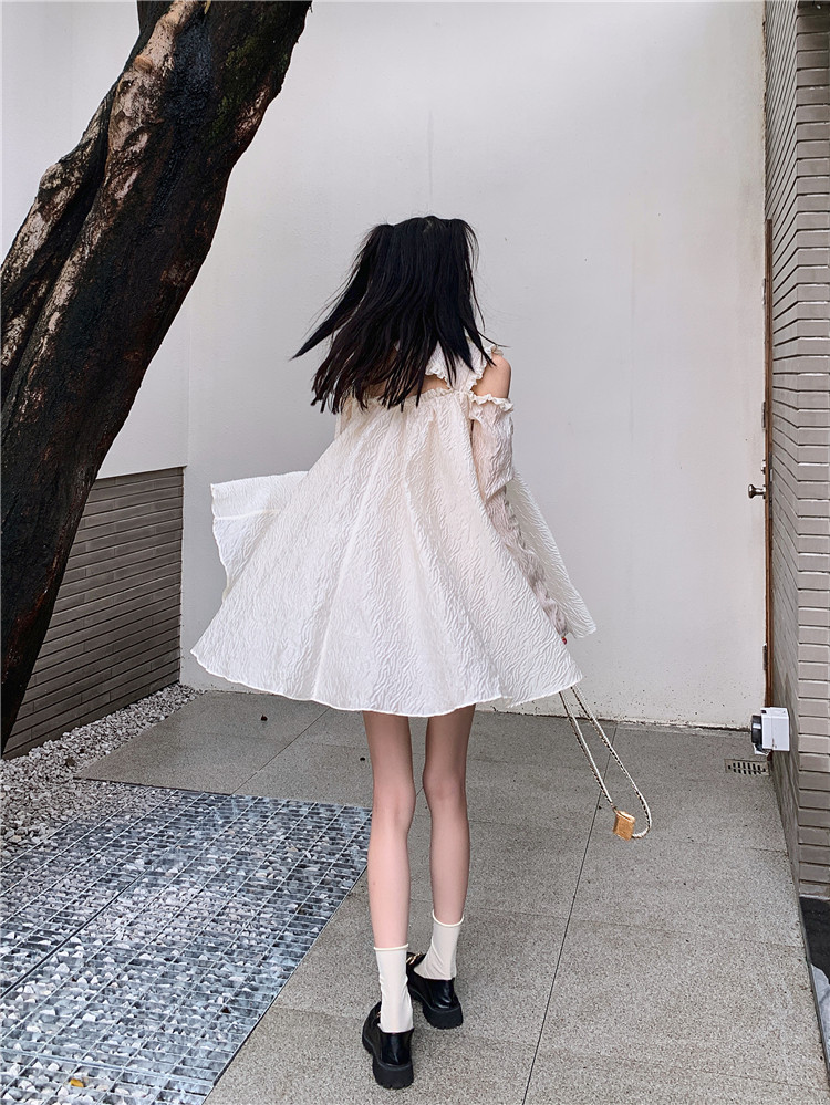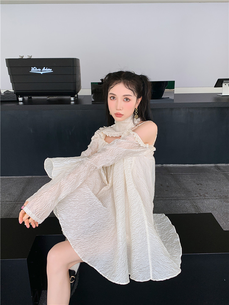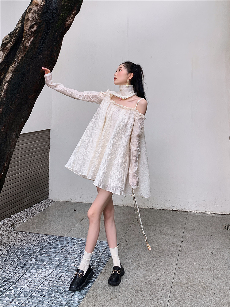 DearGod正韓女裝辣妹風長袖肌理感大擺連衣裙女秋高領鏤空不對稱露肩連衣裙蓬蓬裙