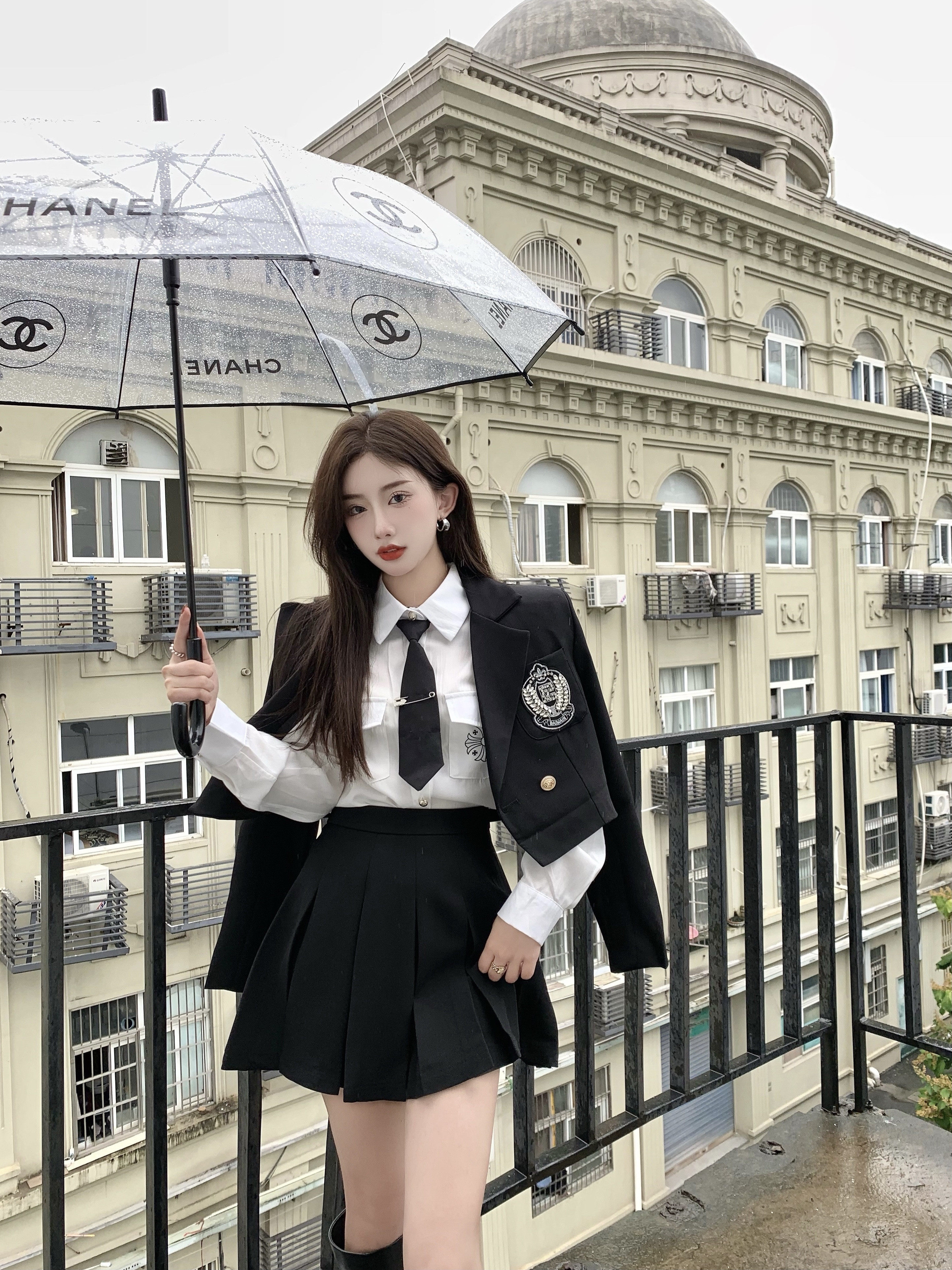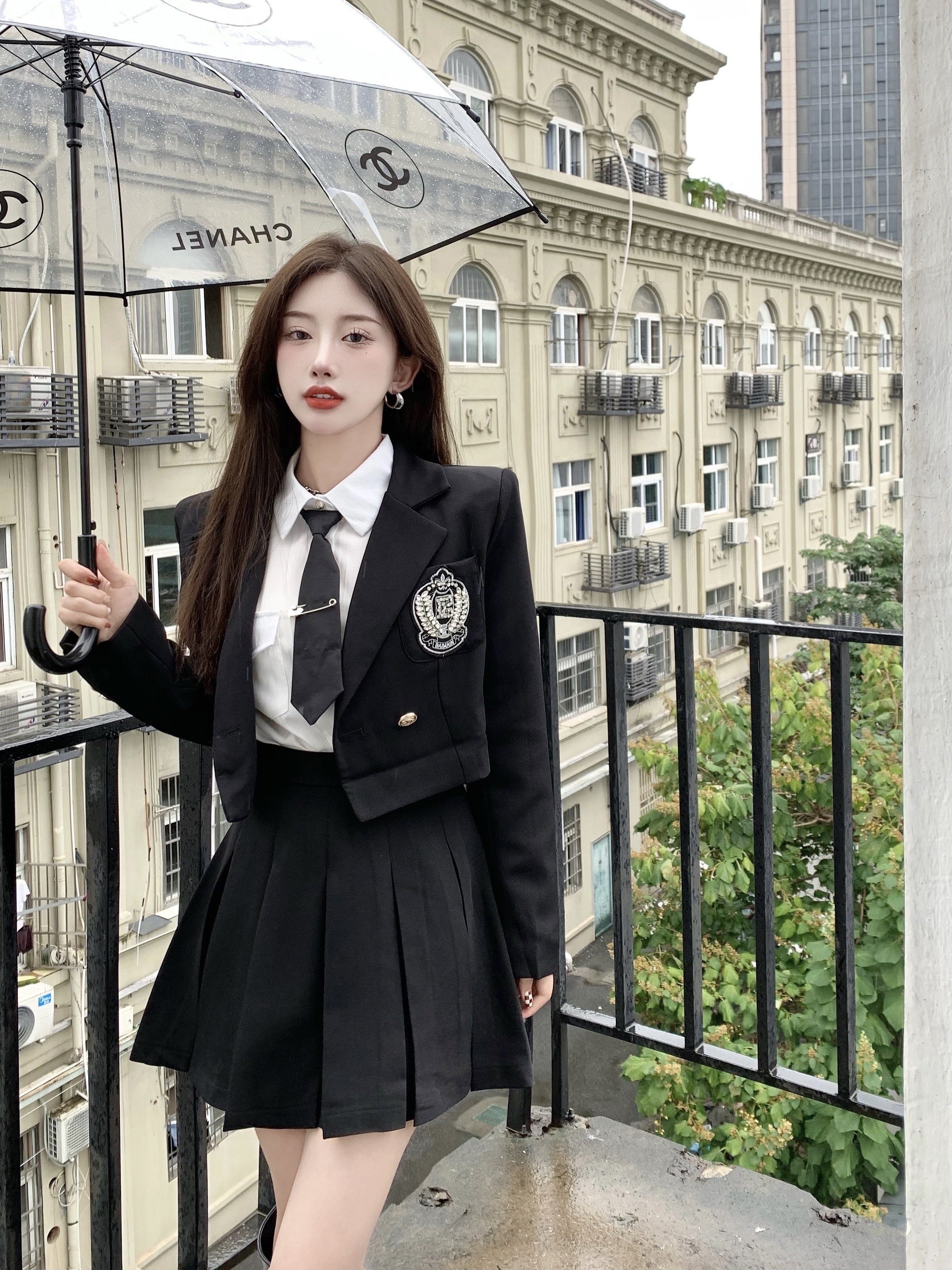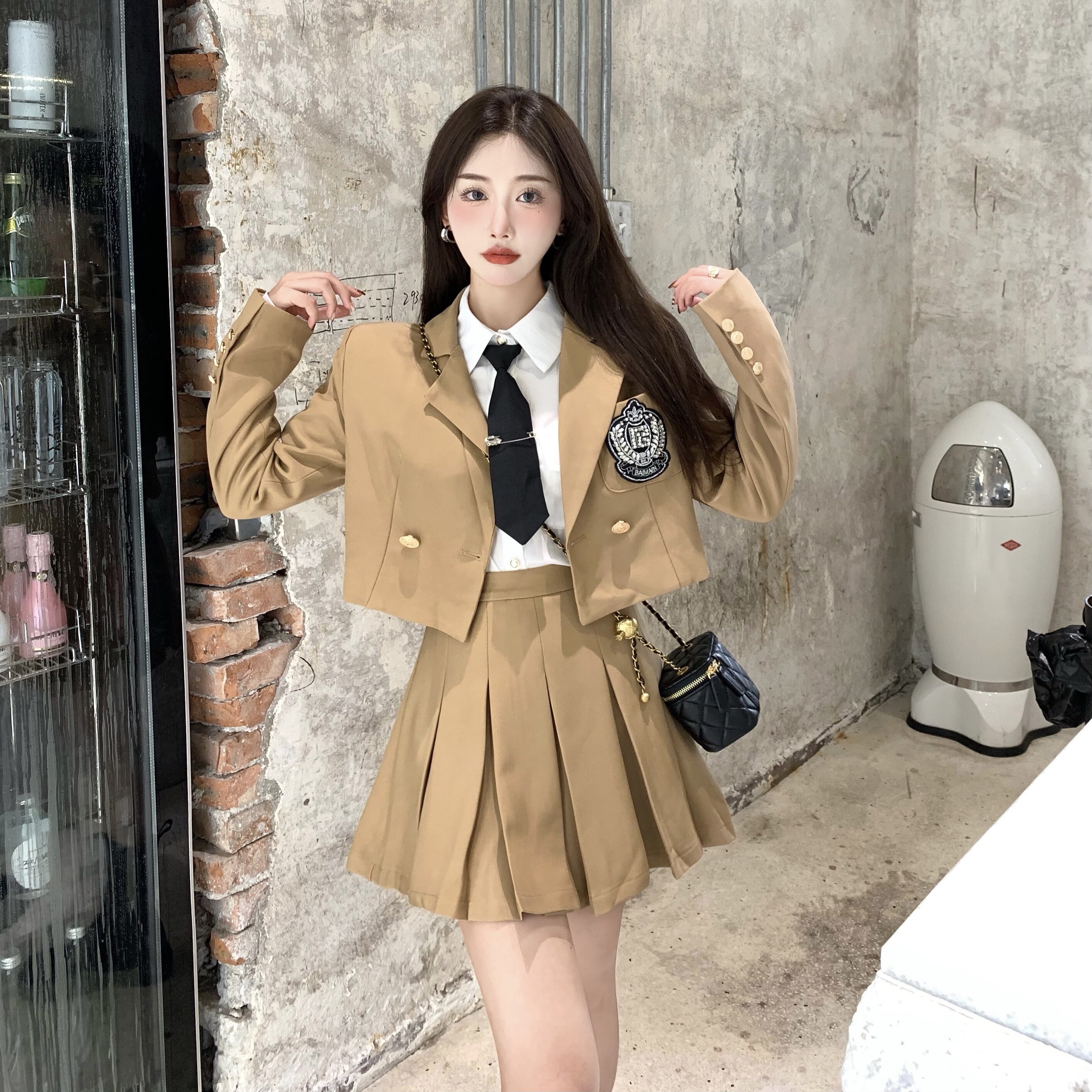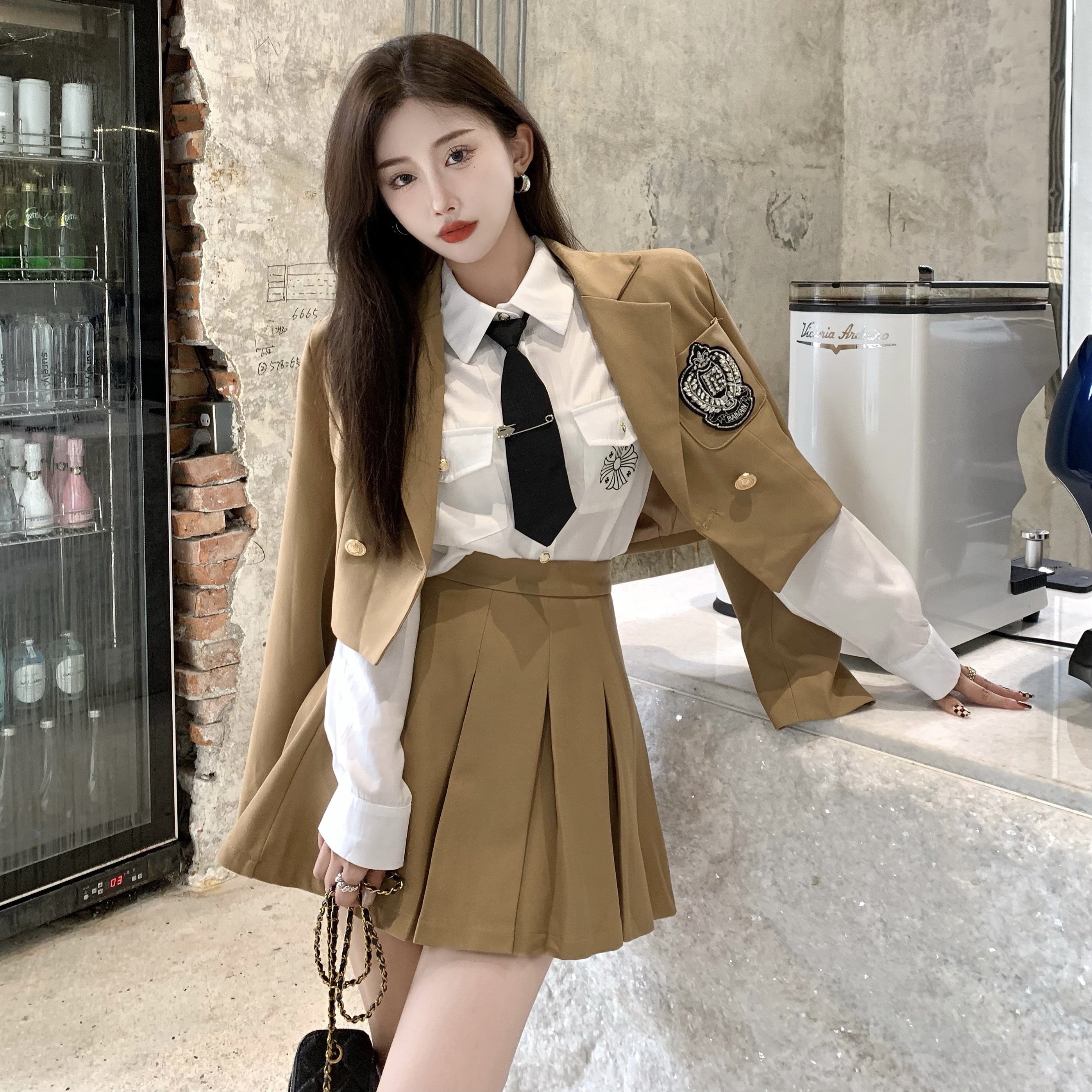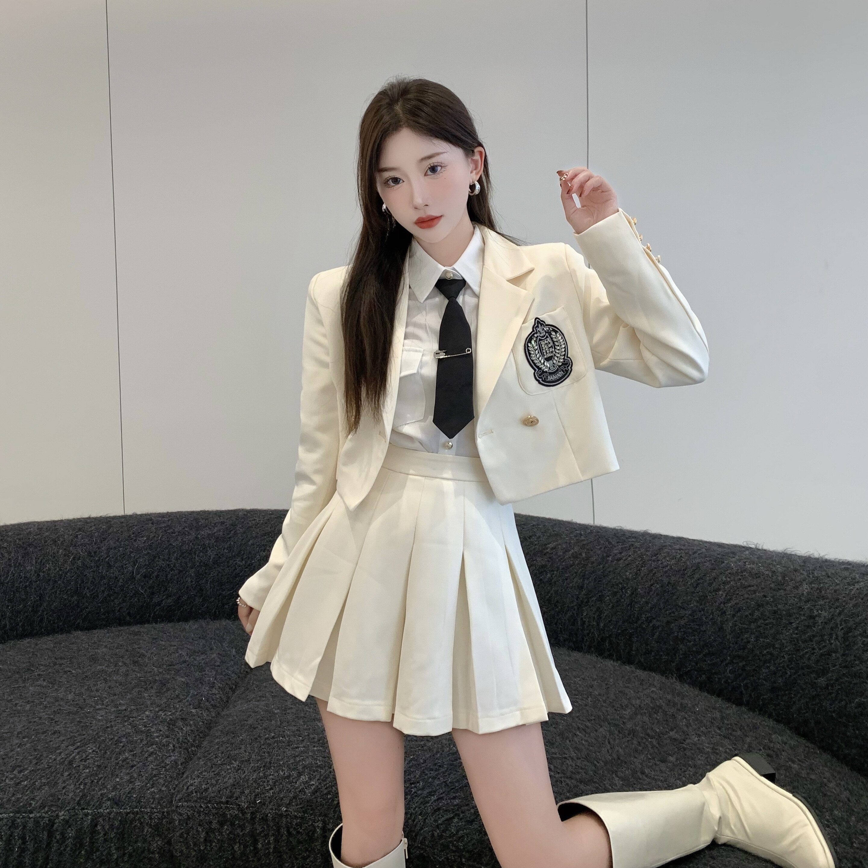 DearGod正韓女裝春秋百搭香港復古chic2022年新款女短款西裝外套高腰百褶裙套裝潮