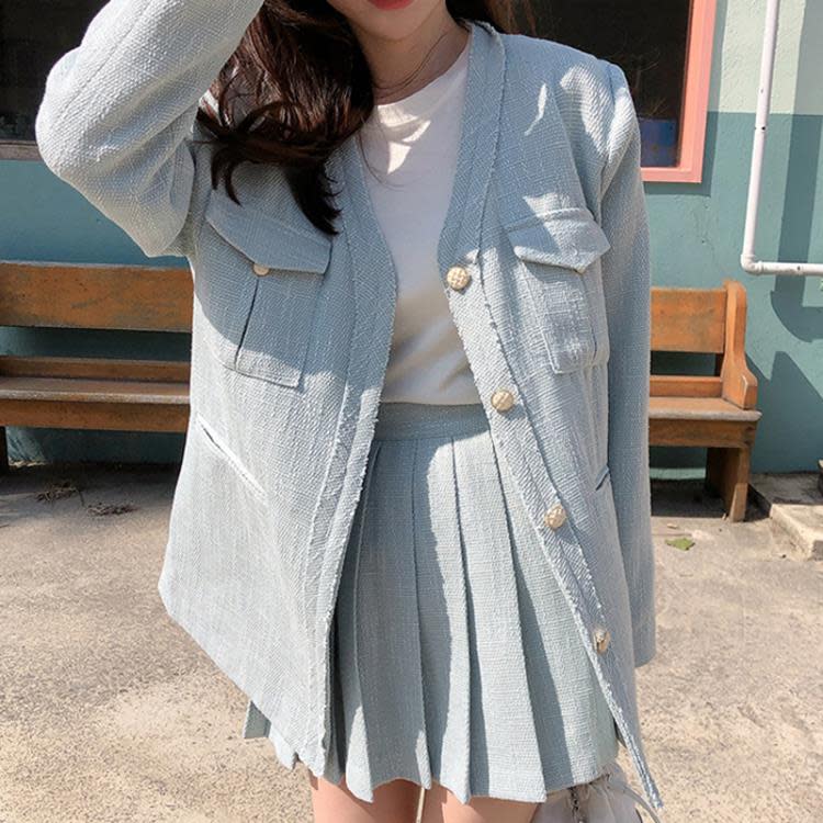 DearGod正韓女裝少量現貨 韓國東大門正品代新春天藍色香風花呢外套百褶半身裙女
