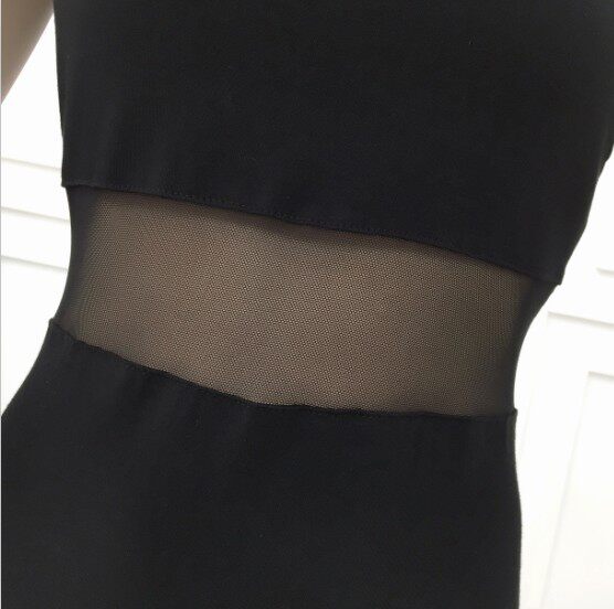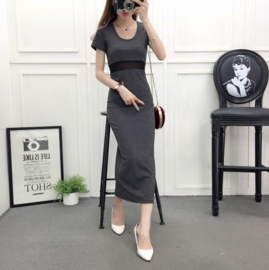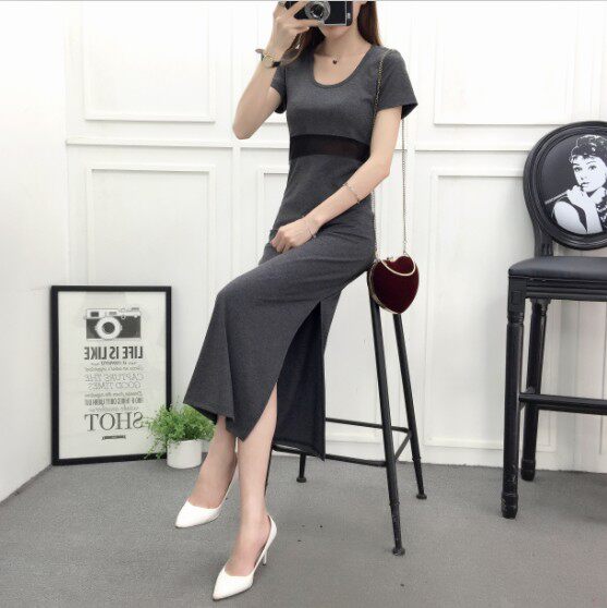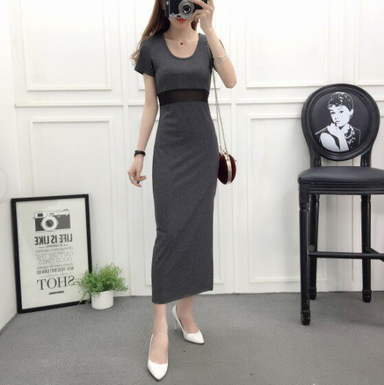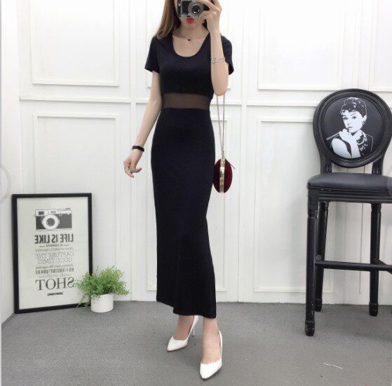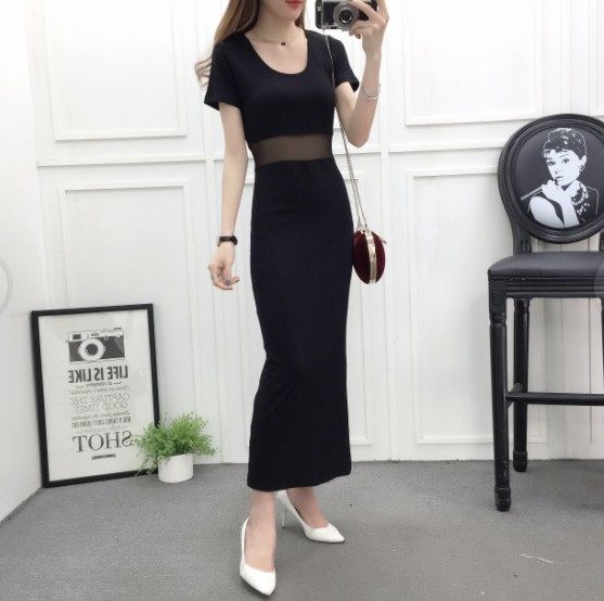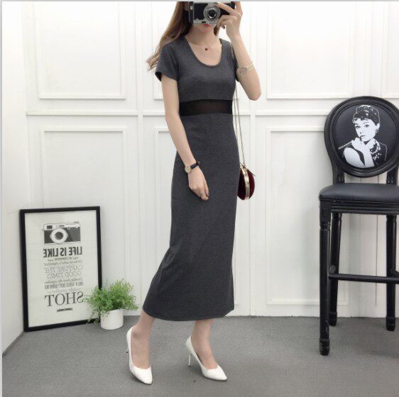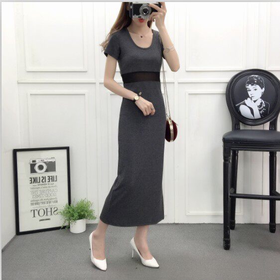 DearGod正韓女裝網紗拼接連身裙女夏季新款莫代爾露腰長裙短袖圓領顯瘦開叉連身裙
