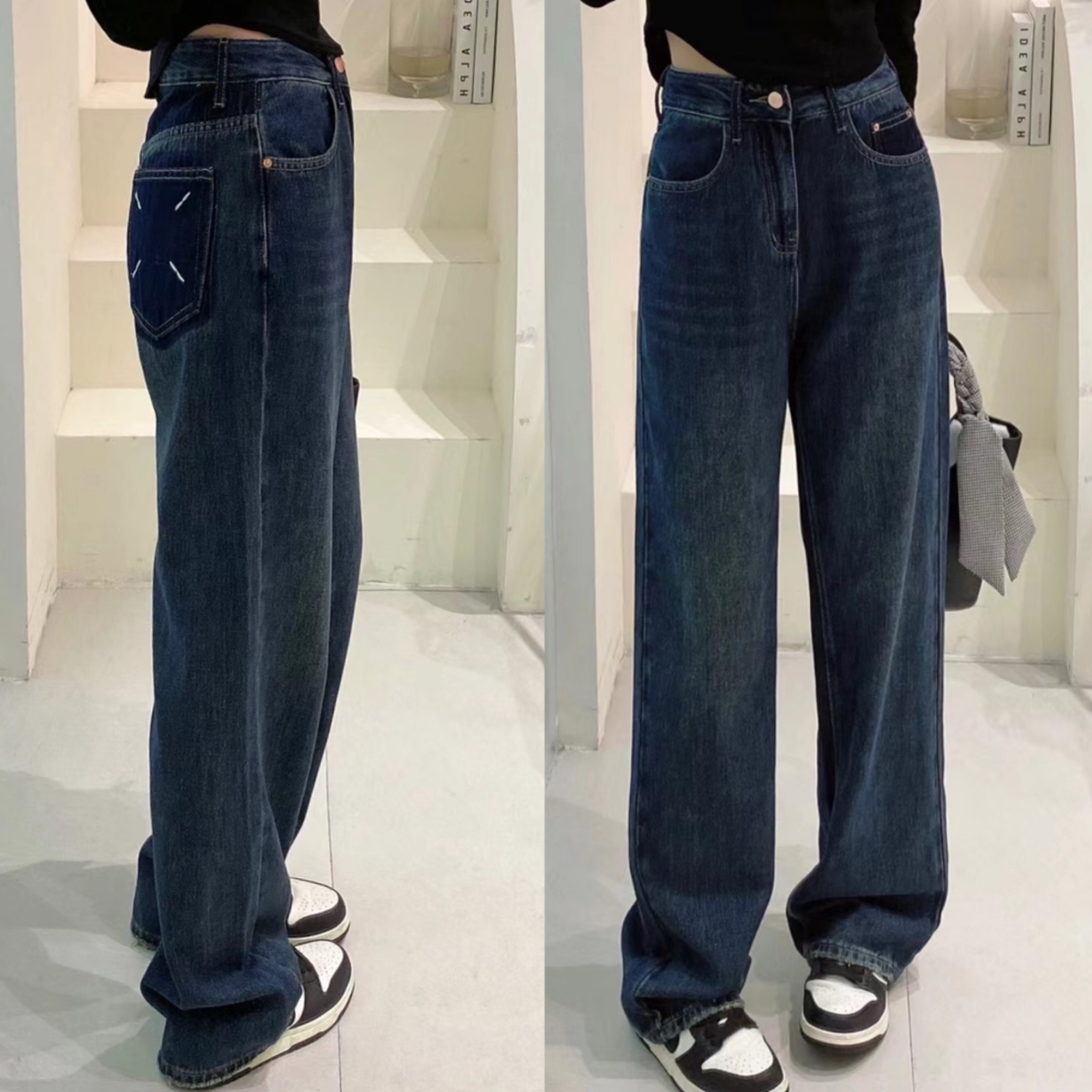DearGod正韓女裝歐洲站2022秋季高腰口袋明線設計拼色直筒褲洋氣深藍牛仔褲長褲潮