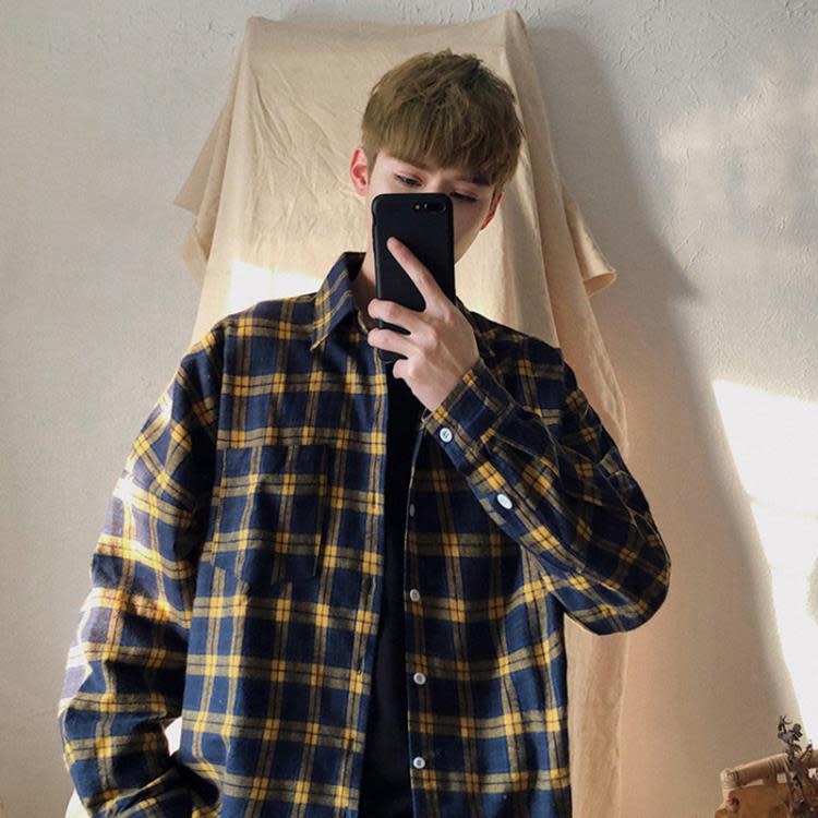 香港秋季格子襯衫男裝正韓情侶長袖襯衣寬松bf風ins學生寸衫外套