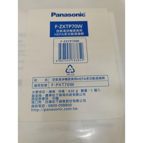 HEPA濾網 F-ZXTP70W 使用壽命:2年