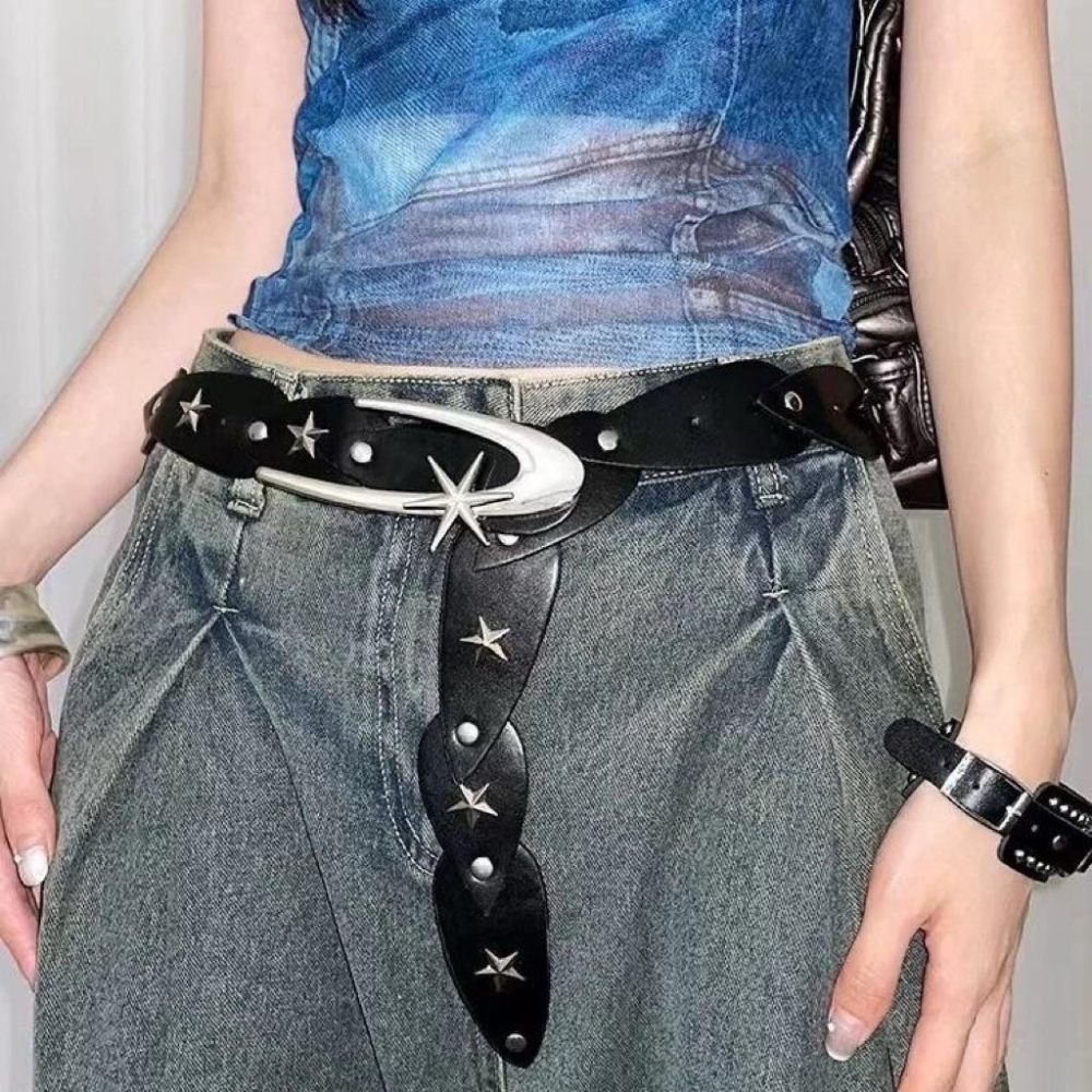 𝟑𝐮𝐧𝐢𝐨𝐧|設計感星月鏈接五角星鉚釘腰帶女褲帶圓環飛行拼接設計腰帶