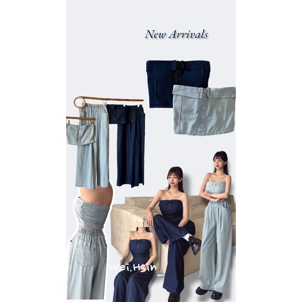抹胸排釦牛仔寬褲套裝