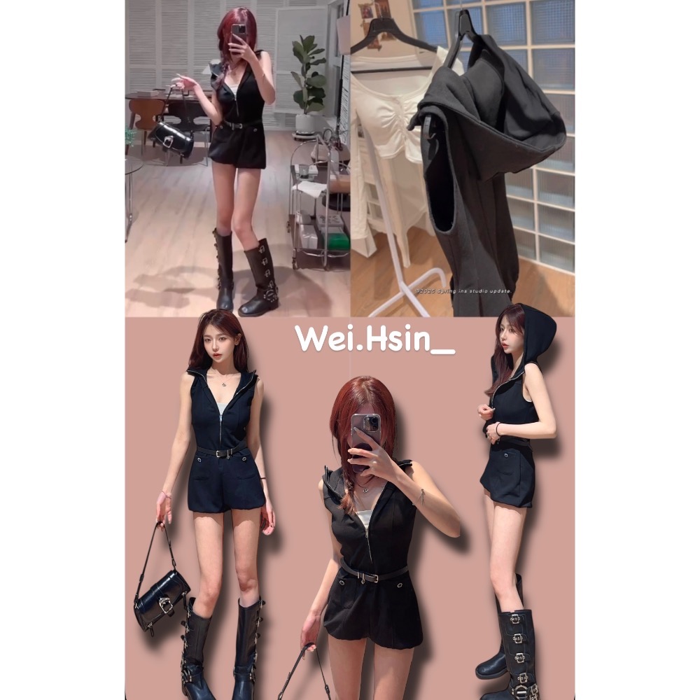小香風,帶帽無袖顯瘦高級黑色連體褲