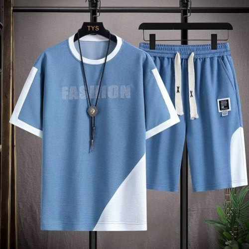 2023年短袖套裝男士夏季新款簡約休閒運動寬松型華夫格搭配一套薄