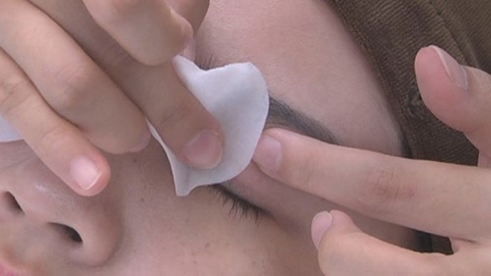 2) 從一眼開始清潔,用指腹按壓住清潔片,從眼頭開始往眼尾方向,輕揉睫毛根部,清除油脂與髒污