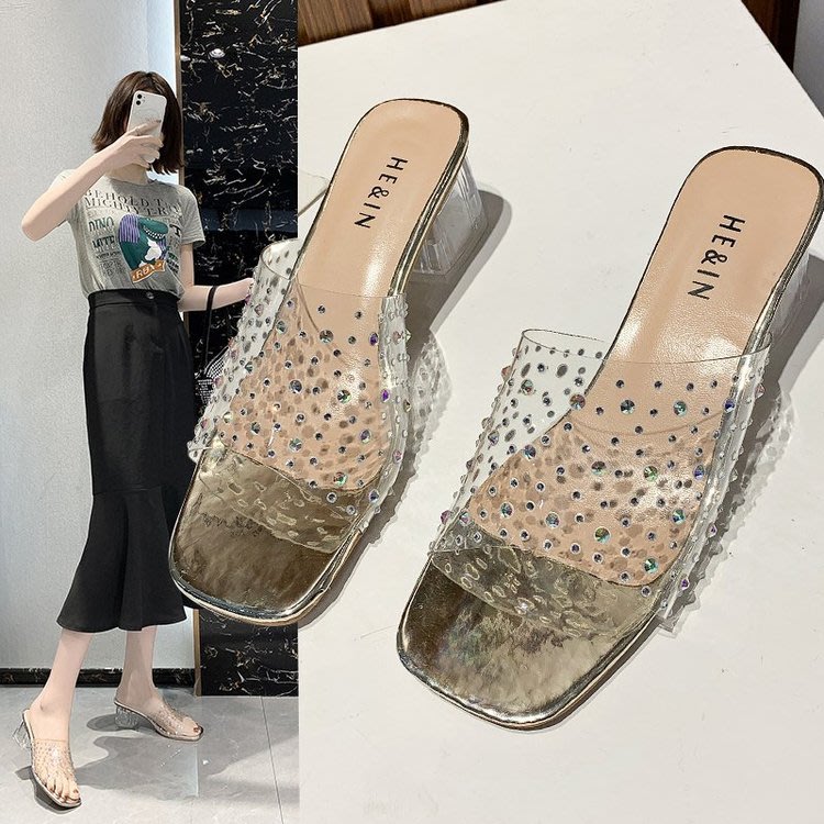 高跟鞋 35-45碼大碼女鞋41肥腳露趾涼鞋女正韓氣質透明一字帶涼拖42