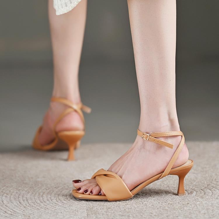 2023年新款高跟鞋女設計感氣質女神范裸色細跟方頭包頭涼鞋批髮