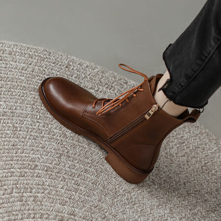 短靴 牛皮2023年秋冬季圓頭低跟復古風女側拉鍊短筒單靴系帶子