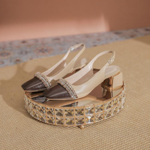 高跟鞋 511-2拼色包頭拖鞋女2023年夏季新款方頭水鉆粗跟后絆帶涼鞋