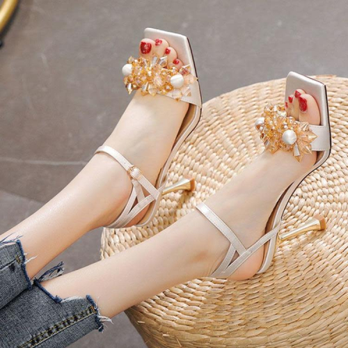 高跟鞋 涼鞋女夏季2023新款水鉆一字帶鞋細跟仙女風時尚性感露趾女鞋
