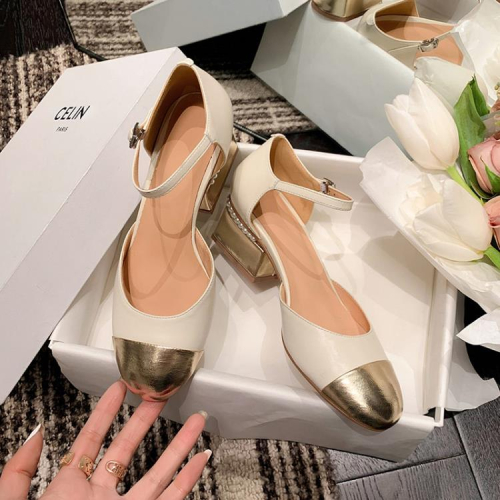 中跟鞋 高跟鞋2023春季新款女鞋粗跟拼色低幫鞋羊皮扣帶包頭包跟涼鞋