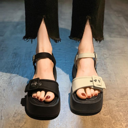 厚底鞋 休閒一字帶搭扣女鞋2023夏季新款女時尚方扣中空透氣舒適涼鞋